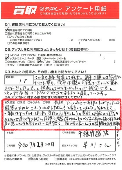 店舗の接客(早川さん)でビジネス的に値切るために車の悪いところを言うのは一切無く、逆に車の良いところの指摘もあり