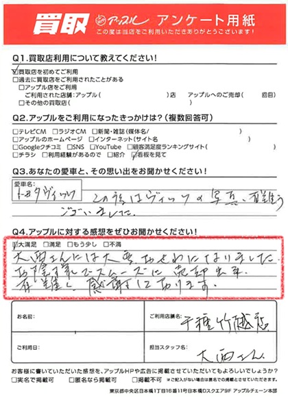 お車のご相談・ 査定だけでもOK! カンタン 入力 30秒 アップルがブランド買取始めました! お電話でも受付中! 受付時間9:30~18:30 052-711-8400 お車のご相談・ 査定だけでもOK! カンタン 入力 30秒 アップルがブランド買取始めました! お電話でも受付中! 受付時間9:30~18:30 052-711-8400 アップルがブランド買取始めました! お電話でも受付中! 受付時間9:30~18:30 052-711-8400 店舗情報 在庫車 スタッフ紹介 ブログ お客様の声 キャンペーン お得 無料査定 click お客様の声 ご記入日: 2025/07/24 S様 車名:トヨタ ヴィッツ 満足度★★★★★大西さんには大変お世話になりました。お陰様でスムーズに売却でき、有難く感謝しております。 前へ 次へ お客様の声一覧を見る