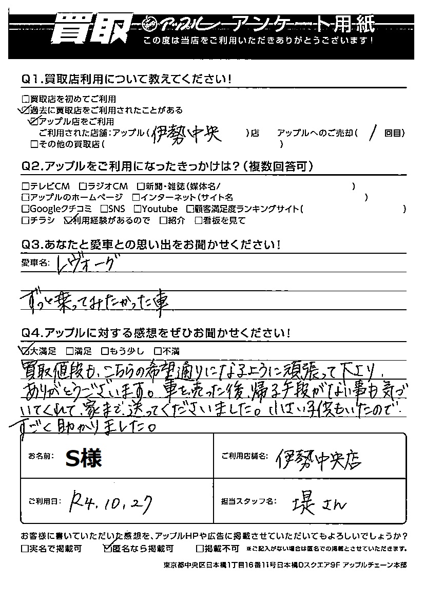 買取値段も、こちらの希望通りになるように頑張って下さり、ありがとうございます。車を売った後に、帰る手段がない事も気づいてくれて、家まで送ってくださいました。小さい子供もいたので、すごく助かりました。