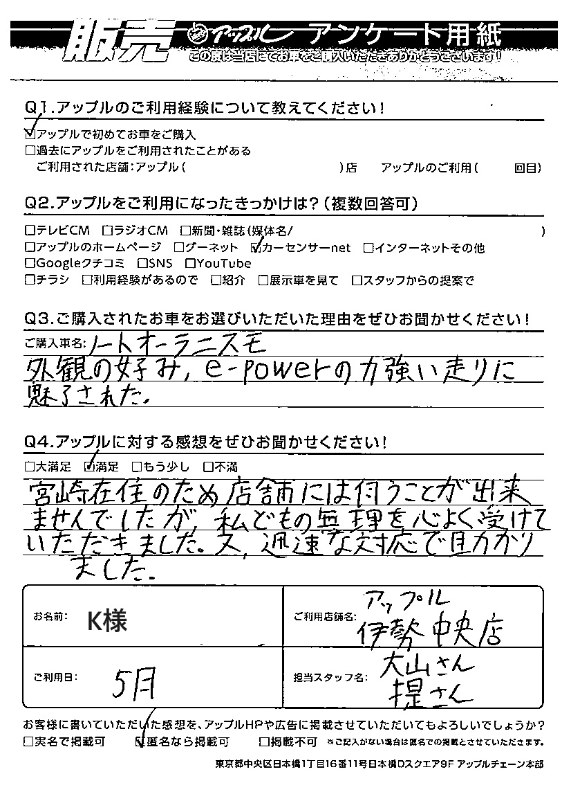 K様 車名:日産 ノートオーラ