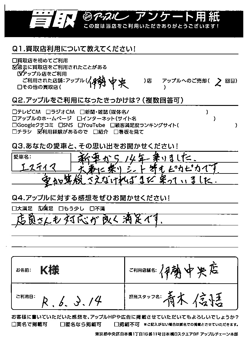 K様 車名:トヨタ エスティマ