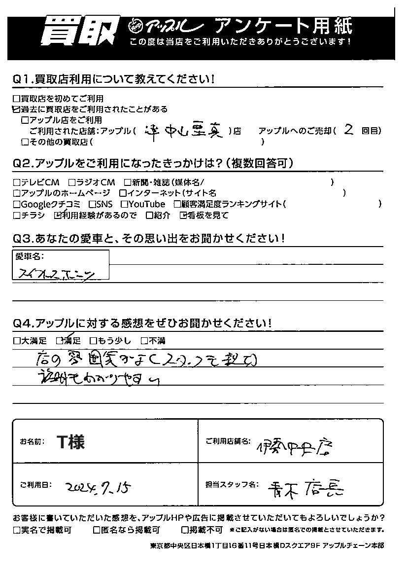 お車のご相談・ 査定だけでもOK! カンタン 入力 30秒 アップルがブランド買取始めました! お電話でも受付中! 受付時間10:00 ~ 19:00 0120-622-880 お車のご相談・ 査定だけでもOK! カンタン 入力 30秒 アップルがブランド買取始めました! お電話でも受付中! 受付時間10:00 ~ 19:00 0120-622-880 アップルがブランド買取始めました! お電話でも受付中! 受付時間10:00 ~ 19:00 0120-622-880 店舗情報 在庫車 スタッフ紹介 ブログ お客様の声 キャンペーン 無料査定 click お客様の声 ご記入日: 2024/08/06 T様 車名:スズキ スイフト ご利用日:2024年7月15日 担当:青木アップルに対する感想をぜひお聞かせください!店の雰囲気がよくスタッフも親切説明もわかりやすい 前へ 次へ お客様の声一覧を見る