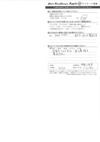 お車のご相談・ 査定だけでもOK! カンタン 入力 30秒 アップルがブランド買取始めました! お電話でも受付中! 受付時間10:00 ~ 19:00 0120-622-880 お車のご相談・ 査定だけでもOK! カンタン 入力 30秒 アップルがブランド買取始めました! お電話でも受付中! 受付時間10:00 ~ 19:00 0120-622-880 アップルがブランド買取始めました! お電話でも受付中! 受付時間10:00 ~ 19:00 0120-622-880 店舗情報 在庫車 スタッフ紹介 ブログ お客様の声 キャンペーン 無料査定 click お客様の声 ご記入日: 2015/04/30 I様 店長のハットリ様も宮嶋様も最高でした! 前へ 次へ お客様の声一覧を見る
