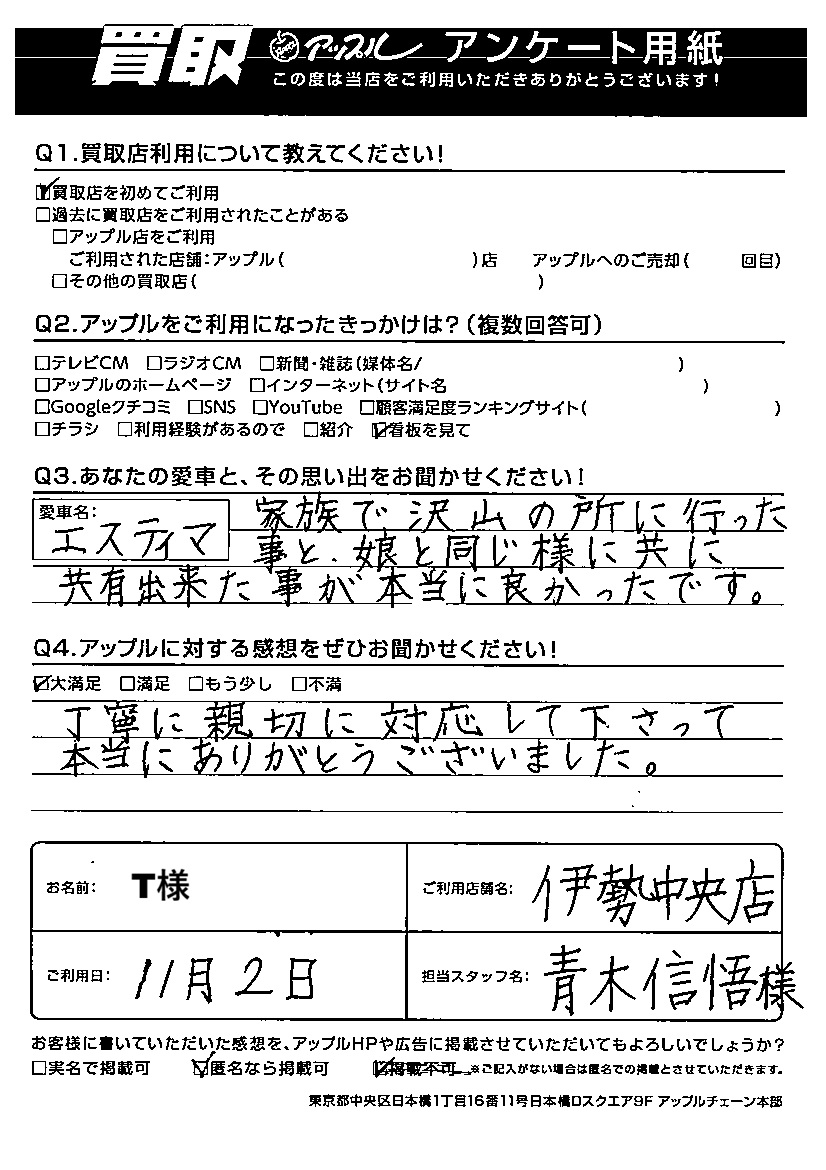 A.愛車名:エスティマ 家族で沢山の所に行った事と、娘と同じ様に共に共有出来た事が本当に良かったです。
