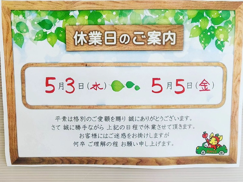 お車のご相談・ 査定だけでもOK! カンタン 入力 30秒 アップルがブランド買取始めました! お電話でも受付中! 受付時間10:00 ~ 19:00 (第4・第5月曜日は18:00閉店の場合あり) 0564-58-1700 お車のご相談・ 査定だけでもOK! カンタン 入力 30秒 アップルがブランド買取始めました! お電話でも受付中! 受付時間10:00 ~ 19:00 (第4・第5月曜日は18:00閉店の場合あり) 0564-58-1700 アップルがブランド買取始めました! お電話でも受付中! 受付時間10:00 ~ 19:00 (第4・第5月曜日は18:00閉店の場合あり) 0564-58-1700 店舗情報 在庫車 スタッフ紹介 ブログ お客様の声 キャンペーン 無料査定 click [ つぶやき ] 2023/05/01 (月) 09:30 ʕ·ᴥ·ʔGW期間の休業のお知らせだよ。 ゴールデンウィーク期間休業のお知らせです(^^)スタッフもお休み頂きたいのでご理解の程、よろしくお願いしますm(_ _)m#アップル#中古車#トラクター#福祉車両#買取#販売#岡崎市買取#岡崎市#西尾市#安城市#アップル岡崎六ッ美店#ゴールデンウィーク#GW 2023-05-01 09:30:45 新しい記事へ 古い記事へ 最新記事 【お車売却100の疑問】アップル岡崎六ッ美店が解説!【63.契約後にキャンセルできる?】ʕ·ᴥ·ʔ冊子作ったよ。ʕ·ᴥ·ʔクラウン買取ご成約ありがとうございます。ʕ·ᴥ·ʔ水曜日は定休日だよ('ω')ノʕ·ᴥ·ʔラパン買取ご成約ありがとうございます。 店舗情報に戻る 月別アーカイブ 2026年04月(4)2026年03月(33)2026年02月(33)2026年01月(53)2025年12月(47)2025年11月(43)2025年10月(34)2025年09月(31)2025年08月(34)2025年07月(33)2025年06月(30)2025年05月(32)2025年04月(47)2025年03月(62)2025年02月(56)2025年01月(62)2024年12月(59)2024年11月(62)2024年10月(62)2024年09月(60)2024年08月(61)2024年07月(62)2024年06月(61)2024年05月(61)2024年04月(61)2024年03月(62)2024年02月(58)2024年01月(62)2023年12月(63)2023年11月(60)2023年10月(62)2023年09月(60)2023年08月(62)2023年07月(64)2023年06月(63)2023年05月(61)2023年04月(60)2023年03月(61)2023年02月(56)2023年01月(61)2022年12月(62)2022年11月(58)2022年10月(63)2022年09月(61)2022年08月(61)2022年07月(60)2022年06月(61)2022年05月(64)2022年04月(60)2022年03月(63)2022年02月(56)2022年01月(60)2021年12月(62)2021年11月(61)2021年10月(63)2021年09月(63)2021年08月(61)2021年07月(40)2021年06月(32)2021年05月(30)2021年04月(28)2021年03月(30)2021年02月(28)2021年01月(31)2020年12月(31)2020年11月(30)2020年10月(31)2020年09月(30)2020年08月(31)2020年07月(31)2020年06月(46)2020年05月(40)2020年04月(30)2020年03月(31)2020年02月(29)2020年01月(31)2019年12月(31)2019年11月(31)2019年10月(33)2019年09月(25)2019年08月(14)2019年07月(17)2019年06月(14)2019年05月(15)2019年04月(16)2019年03月(10)2019年02月(13)2019年01月(14)2018年12月(15)2018年11月(14)2018年10月(15)2018年09月(14)2018年08月(11)2018年07月(4)2018年06月(8)2018年05月(12)2018年04月(14)2018年03月(13)2018年02月(11)2018年01月(20)2017年12月(18)2017年11月(7)2017年10月(5)2017年09月(8)2017年08月(12)2017年07月(7)2017年06月(10)2017年05月(12)2017年04月(14)2017年03月(9)2017年02月(15)2017年01月(23)2016年12月(23)2016年11月(25)2016年10月(27)2016年09月(23)2016年08月(23)2016年07月(26)2016年06月(22)2016年05月(13)2016年04月(24)2016年03月(27)2016年02月(27)2016年01月(25)2015年12月(10)2015年11月(6)2015年10月(7)2015年09月(15)2015年08月(9)2015年07月(6)2015年06月(7)2015年05月(7)2015年04月(10)2015年03月(7)2015年02月(12)2015年01月(14)2014年12月(16)2014年11月(9)2014年10月(4)2014年09月(1)2014年08月(6)2014年07月(3)2014年06月(1)2014年05月(1)2014年02月(2)2013年11月(1)2013年10月(1)2013年09月(1)2013年08月(1)2013年07月(3)2012年11月(1)2012年04月(1)2012年02月(1)2011年11月(1)2011年10月(1)2011年09月(1)2011年08月(1)2011年07月(1)2011年05月(1)2011年02月(1)2011年01月(4)2010年12月(11)2010年11月(20)2010年10月(23)2010年09月(7)2010年08月(16)2010年07月(16)2010年06月(5)