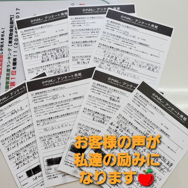 お車のご相談・ 査定だけでもOK! カンタン 入力 30秒 アップルがブランド買取始めました! お電話でも受付中! 受付時間10:00 ~ 19:00 (第4・第5月曜日は18:00閉店の場合あり) 0564-58-1700 お車のご相談・ 査定だけでもOK! カンタン 入力 30秒 アップルがブランド買取始めました! お電話でも受付中! 受付時間10:00 ~ 19:00 (第4・第5月曜日は18:00閉店の場合あり) 0564-58-1700 アップルがブランド買取始めました! お電話でも受付中! 受付時間10:00 ~ 19:00 (第4・第5月曜日は18:00閉店の場合あり) 0564-58-1700 店舗情報 在庫車 スタッフ紹介 ブログ お客様の声 キャンペーン 無料査定 click [ つぶやき ] 2025/02/04 (火) 10:26 ʕ·ᴥ·ʔお客様の声だよ。 当店をご利用頂いた方全員にアンケートの記入をお願いしてます。☺お店では書きにくいと思いますので自宅でゆっくり書いてください。切手の要らないハガキなのでそのままポストに投函でokですhttp://www.apple-car.co.jp/okazaki_mutsumi/#アップル#岡崎市#豊田市#中古車#福祉車両#トラクター#キャンピングカー#ダイエット#買取#販売#タント 2025-02-04 10:26:45 新しい記事へ 古い記事へ 最新記事 【お車売却100の疑問】アップル岡崎六ッ美店が解説!【63.契約後にキャンセルできる?】ʕ·ᴥ·ʔ冊子作ったよ。ʕ·ᴥ·ʔクラウン買取ご成約ありがとうございます。ʕ·ᴥ·ʔ水曜日は定休日だよ('ω')ノʕ·ᴥ·ʔラパン買取ご成約ありがとうございます。 店舗情報に戻る 月別アーカイブ 2026年04月(4)2026年03月(33)2026年02月(33)2026年01月(53)2025年12月(47)2025年11月(43)2025年10月(34)2025年09月(31)2025年08月(34)2025年07月(33)2025年06月(30)2025年05月(32)2025年04月(47)2025年03月(62)2025年02月(56)2025年01月(62)2024年12月(59)2024年11月(62)2024年10月(62)2024年09月(60)2024年08月(61)2024年07月(62)2024年06月(61)2024年05月(61)2024年04月(61)2024年03月(62)2024年02月(58)2024年01月(62)2023年12月(63)2023年11月(60)2023年10月(62)2023年09月(60)2023年08月(62)2023年07月(64)2023年06月(63)2023年05月(61)2023年04月(60)2023年03月(61)2023年02月(56)2023年01月(61)2022年12月(62)2022年11月(58)2022年10月(63)2022年09月(61)2022年08月(61)2022年07月(60)2022年06月(61)2022年05月(64)2022年04月(60)2022年03月(63)2022年02月(56)2022年01月(60)2021年12月(62)2021年11月(61)2021年10月(63)2021年09月(63)2021年08月(61)2021年07月(40)2021年06月(32)2021年05月(30)2021年04月(28)2021年03月(30)2021年02月(28)2021年01月(31)2020年12月(31)2020年11月(30)2020年10月(31)2020年09月(30)2020年08月(31)2020年07月(31)2020年06月(46)2020年05月(40)2020年04月(30)2020年03月(31)2020年02月(29)2020年01月(31)2019年12月(31)2019年11月(31)2019年10月(33)2019年09月(25)2019年08月(14)2019年07月(17)2019年06月(14)2019年05月(15)2019年04月(16)2019年03月(10)2019年02月(13)2019年01月(14)2018年12月(15)2018年11月(14)2018年10月(15)2018年09月(14)2018年08月(11)2018年07月(4)2018年06月(8)2018年05月(12)2018年04月(14)2018年03月(13)2018年02月(11)2018年01月(20)2017年12月(18)2017年11月(7)2017年10月(5)2017年09月(8)2017年08月(12)2017年07月(7)2017年06月(10)2017年05月(12)2017年04月(14)2017年03月(9)2017年02月(15)2017年01月(23)2016年12月(23)2016年11月(25)2016年10月(27)2016年09月(23)2016年08月(23)2016年07月(26)2016年06月(22)2016年05月(13)2016年04月(24)2016年03月(27)2016年02月(27)2016年01月(25)2015年12月(10)2015年11月(6)2015年10月(7)2015年09月(15)2015年08月(9)2015年07月(6)2015年06月(7)2015年05月(7)2015年04月(10)2015年03月(7)2015年02月(12)2015年01月(14)2014年12月(16)2014年11月(9)2014年10月(4)2014年09月(1)2014年08月(6)2014年07月(3)2014年06月(1)2014年05月(1)2014年02月(2)2013年11月(1)2013年10月(1)2013年09月(1)2013年08月(1)2013年07月(3)2012年11月(1)2012年04月(1)2012年02月(1)2011年11月(1)2011年10月(1)2011年09月(1)2011年08月(1)2011年07月(1)2011年05月(1)2011年02月(1)2011年01月(4)2010年12月(11)2010年11月(20)2010年10月(23)2010年09月(7)2010年08月(16)2010年07月(16)2010年06月(5)