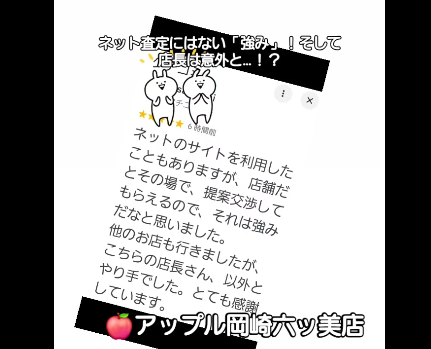 お車のご相談・ 査定だけでもOK! カンタン 入力 30秒 アップルがブランド買取始めました! お電話でも受付中! 受付時間10:00 ~ 19:00 (第4・第5月曜日は18:00閉店の場合あり) 0564-58-1700 お車のご相談・ 査定だけでもOK! カンタン 入力 30秒 アップルがブランド買取始めました! お電話でも受付中! 受付時間10:00 ~ 19:00 (第4・第5月曜日は18:00閉店の場合あり) 0564-58-1700 アップルがブランド買取始めました! お電話でも受付中! 受付時間10:00 ~ 19:00 (第4・第5月曜日は18:00閉店の場合あり) 0564-58-1700 店舗情報 在庫車 スタッフ紹介 ブログ お客様の声 キャンペーン 無料査定 click [ つぶやき ] 2026/04/12 (日) 13:02 ʕ·ᴥ·ʔクチコミ投稿いただき有難うございます。 こんにちは、店長のONOです!Googleに頂いた嬉しいクチコミをご紹介します。 対面だからこその「強み」「店舗だとその場で提案交渉してもらえるのは強み」とのお言葉、ありがとうございます。ネット査定も便利ですが、対面ならではのリアルタイムの交渉を評価していただき自信になりました! 店長は「意外と」…?そして「こちらの店長さん、意外とやり手でした」との評価も(笑)。「意外と」という部分が私らしいですが、最高の褒め言葉です!これからも「意外とやるじゃん!」と言っていただけるよう頑張ります。素敵なご縁をありがとうございました!#アップル岡崎六ッ美店 #クチコミ感謝 #対面査定 #高価買取 #意外とやり手 2026-04-12 13:02:00 新しい記事へ 古い記事へ 最新記事 ʕ·ᴥ·ʔ水曜日は定休日だよ('ω')ノʕ·ᴥ·ʔ豆知識だよ。ʕ·ᴥ·ʔVWゴルフ買取ご成約ありがとうございます。ʕ·ᴥ·ʔクチコミ投稿いただき有難うございます。【お車売却100の疑問】【64.買取店に預けた車が事故に遭った場合の責任は?】 店舗情報に戻る 月別アーカイブ 2026年04月(15)2026年03月(33)2026年02月(33)2026年01月(53)2025年12月(47)2025年11月(43)2025年10月(34)2025年09月(31)2025年08月(34)2025年07月(33)2025年06月(30)2025年05月(32)2025年04月(47)2025年03月(62)2025年02月(56)2025年01月(62)2024年12月(59)2024年11月(62)2024年10月(62)2024年09月(60)2024年08月(61)2024年07月(62)2024年06月(61)2024年05月(61)2024年04月(61)2024年03月(62)2024年02月(58)2024年01月(62)2023年12月(63)2023年11月(60)2023年10月(62)2023年09月(60)2023年08月(62)2023年07月(64)2023年06月(63)2023年05月(61)2023年04月(60)2023年03月(61)2023年02月(56)2023年01月(61)2022年12月(62)2022年11月(58)2022年10月(63)2022年09月(61)2022年08月(61)2022年07月(60)2022年06月(61)2022年05月(64)2022年04月(60)2022年03月(63)2022年02月(56)2022年01月(60)2021年12月(62)2021年11月(61)2021年10月(63)2021年09月(63)2021年08月(61)2021年07月(40)2021年06月(32)2021年05月(30)2021年04月(28)2021年03月(30)2021年02月(28)2021年01月(31)2020年12月(31)2020年11月(30)2020年10月(31)2020年09月(30)2020年08月(31)2020年07月(31)2020年06月(46)2020年05月(40)2020年04月(30)2020年03月(31)2020年02月(29)2020年01月(31)2019年12月(31)2019年11月(31)2019年10月(33)2019年09月(25)2019年08月(14)2019年07月(17)2019年06月(14)2019年05月(15)2019年04月(16)2019年03月(10)2019年02月(13)2019年01月(14)2018年12月(15)2018年11月(14)2018年10月(15)2018年09月(14)2018年08月(11)2018年07月(4)2018年06月(8)2018年05月(12)2018年04月(14)2018年03月(13)2018年02月(11)2018年01月(20)2017年12月(18)2017年11月(7)2017年10月(5)2017年09月(8)2017年08月(12)2017年07月(7)2017年06月(10)2017年05月(12)2017年04月(14)2017年03月(9)2017年02月(15)2017年01月(23)2016年12月(23)2016年11月(25)2016年10月(27)2016年09月(23)2016年08月(23)2016年07月(26)2016年06月(22)2016年05月(13)2016年04月(24)2016年03月(27)2016年02月(27)2016年01月(25)2015年12月(10)2015年11月(6)2015年10月(7)2015年09月(15)2015年08月(9)2015年07月(6)2015年06月(7)2015年05月(7)2015年04月(10)2015年03月(7)2015年02月(12)2015年01月(14)2014年12月(16)2014年11月(9)2014年10月(4)2014年09月(1)2014年08月(6)2014年07月(3)2014年06月(1)2014年05月(1)2014年02月(2)2013年11月(1)2013年10月(1)2013年09月(1)2013年08月(1)2013年07月(3)2012年11月(1)2012年04月(1)2012年02月(1)2011年11月(1)2011年10月(1)2011年09月(1)2011年08月(1)2011年07月(1)2011年05月(1)2011年02月(1)2011年01月(4)2010年12月(11)2010年11月(20)2010年10月(23)2010年09月(7)2010年08月(16)2010年07月(16)2010年06月(5)