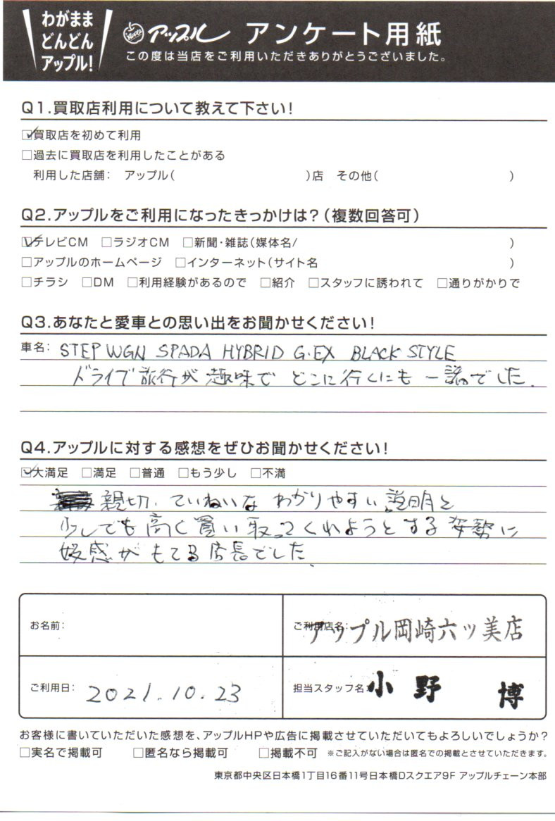 お車のご相談・ 査定だけでもOK! カンタン 入力 30秒 アップルがブランド買取始めました! お電話でも受付中! 受付時間10:00 ~ 19:00 (第4・第5月曜日は18:00閉店の場合あり) 0564-58-1700 お車のご相談・ 査定だけでもOK! カンタン 入力 30秒 アップルがブランド買取始めました! お電話でも受付中! 受付時間10:00 ~ 19:00 (第4・第5月曜日は18:00閉店の場合あり) 0564-58-1700 アップルがブランド買取始めました! お電話でも受付中! 受付時間10:00 ~ 19:00 (第4・第5月曜日は18:00閉店の場合あり) 0564-58-1700 店舗情報 在庫車 スタッフ紹介 ブログ お客様の声 キャンペーン 無料査定 click お客様の声 ご記入日: 2021/10/23 愛知県 匿名希望様 車名:ホンダ ステップワゴン 親切、ていねいなわかりやすい説明を少しでも高く買い取ってくれようとする姿勢に好感がもてる店長でした。 前へ 次へ お客様の声一覧を見る