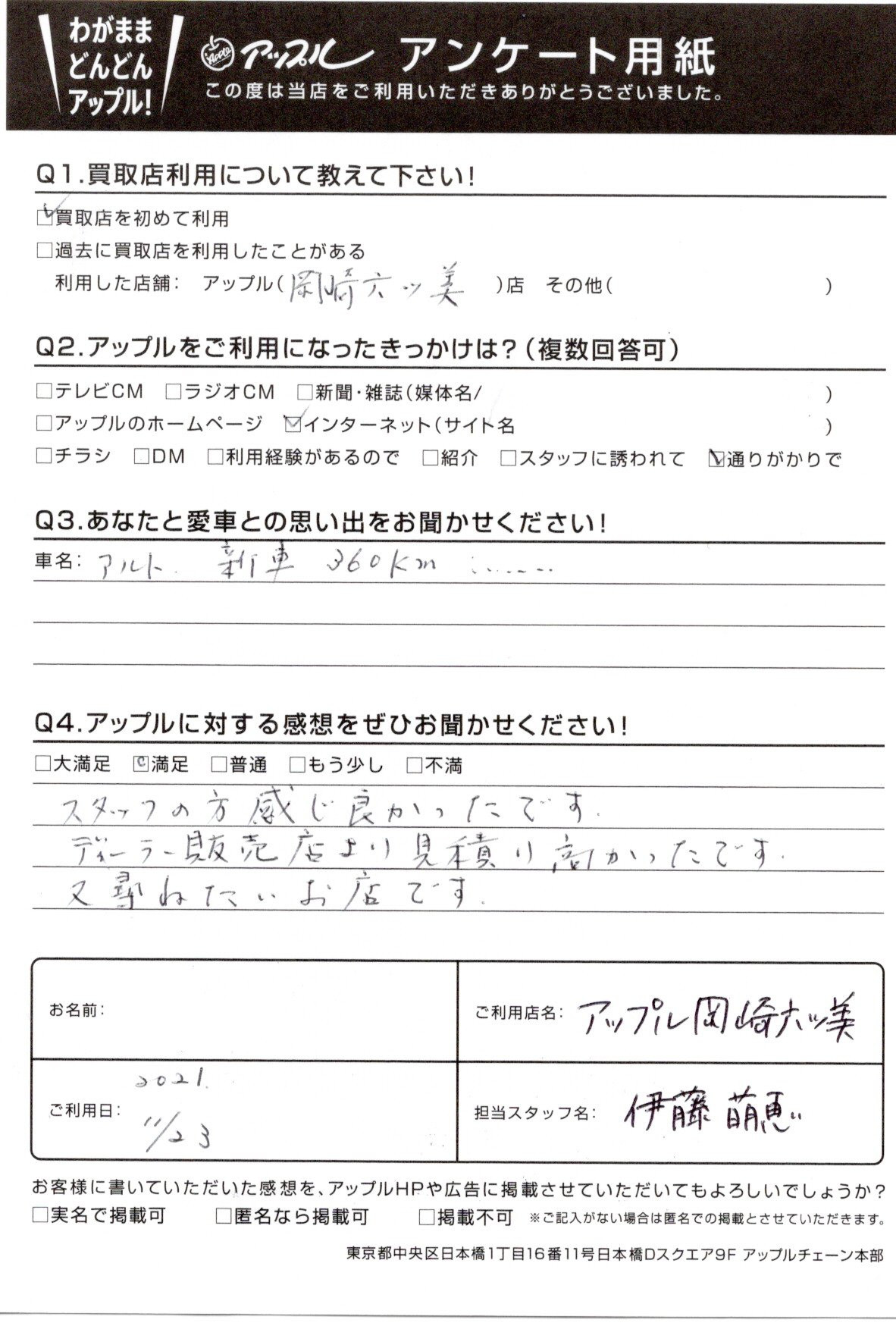 お車のご相談・ 査定だけでもOK! カンタン 入力 30秒 アップルがブランド買取始めました! お電話でも受付中! 受付時間10:00 ~ 19:00 (第4・第5月曜日は18:00閉店の場合あり) 0564-58-1700 お車のご相談・ 査定だけでもOK! カンタン 入力 30秒 アップルがブランド買取始めました! お電話でも受付中! 受付時間10:00 ~ 19:00 (第4・第5月曜日は18:00閉店の場合あり) 0564-58-1700 アップルがブランド買取始めました! お電話でも受付中! 受付時間10:00 ~ 19:00 (第4・第5月曜日は18:00閉店の場合あり) 0564-58-1700 店舗情報 在庫車 スタッフ紹介 ブログ お客様の声 キャンペーン 無料査定 click お客様の声 ご記入日: 2021/11/23 愛知県 匿名希望様 車名:スズキ アルト (2015年12月以降のワークス含む) スタッフの方感じ良かったです。ディーラー販売店より見積り高かったです。又尋ねたいお店です。 前へ 次へ お客様の声一覧を見る