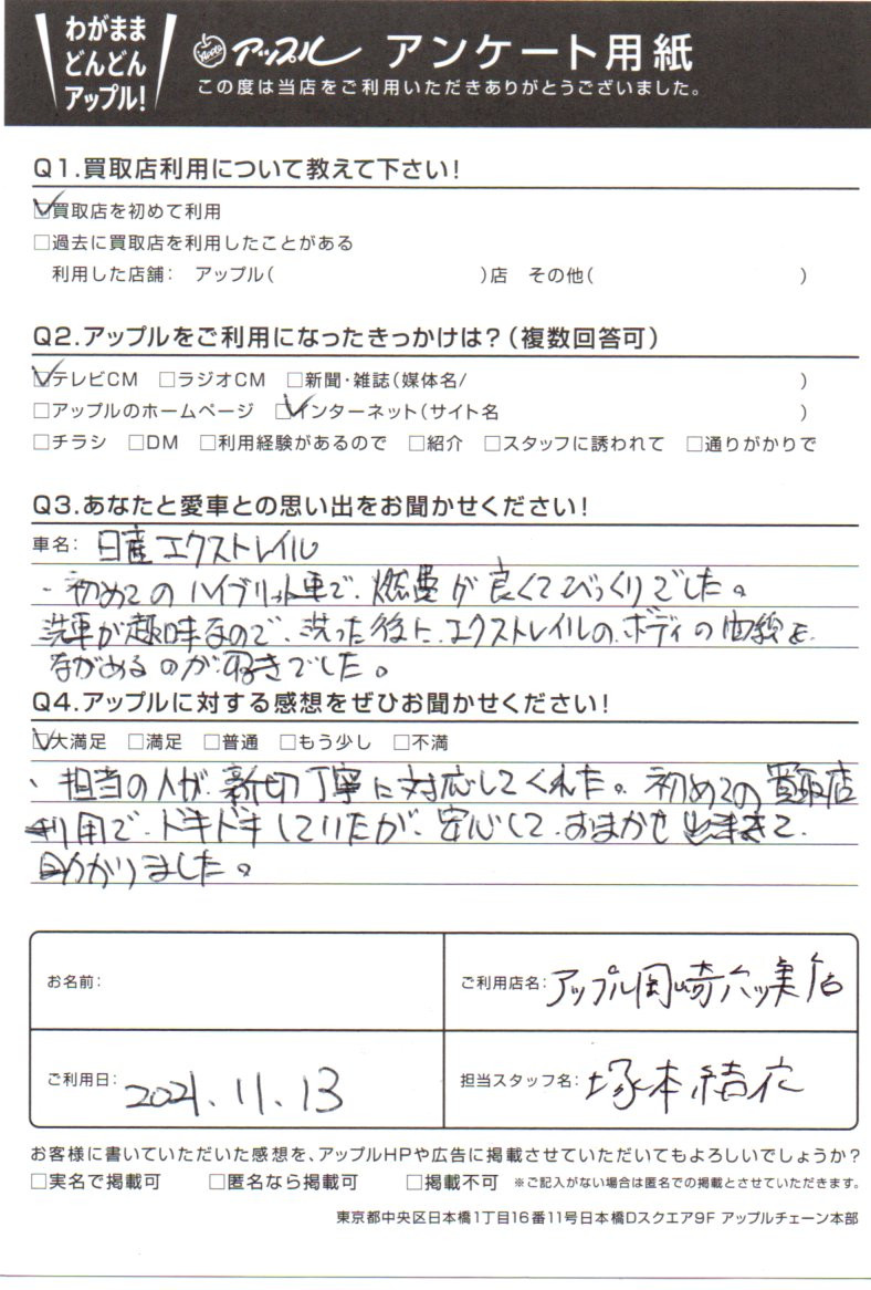 お車のご相談・ 査定だけでもOK! カンタン 入力 30秒 アップルがブランド買取始めました! お電話でも受付中! 受付時間10:00 ~ 19:00 (第4・第5月曜日は18:00閉店の場合あり) 0564-58-1700 お車のご相談・ 査定だけでもOK! カンタン 入力 30秒 アップルがブランド買取始めました! お電話でも受付中! 受付時間10:00 ~ 19:00 (第4・第5月曜日は18:00閉店の場合あり) 0564-58-1700 アップルがブランド買取始めました! お電話でも受付中! 受付時間10:00 ~ 19:00 (第4・第5月曜日は18:00閉店の場合あり) 0564-58-1700 店舗情報 在庫車 スタッフ紹介 ブログ お客様の声 キャンペーン 無料査定 click お客様の声 ご記入日: 2021/11/13 愛知県 匿名希望様 車名:日産 エクストレイル 担当の人が親切丁寧に対応してくれた。初めての買取店利用でドキドキしていたが、安心しておまかせ出来て助かりました。 前へ 次へ お客様の声一覧を見る