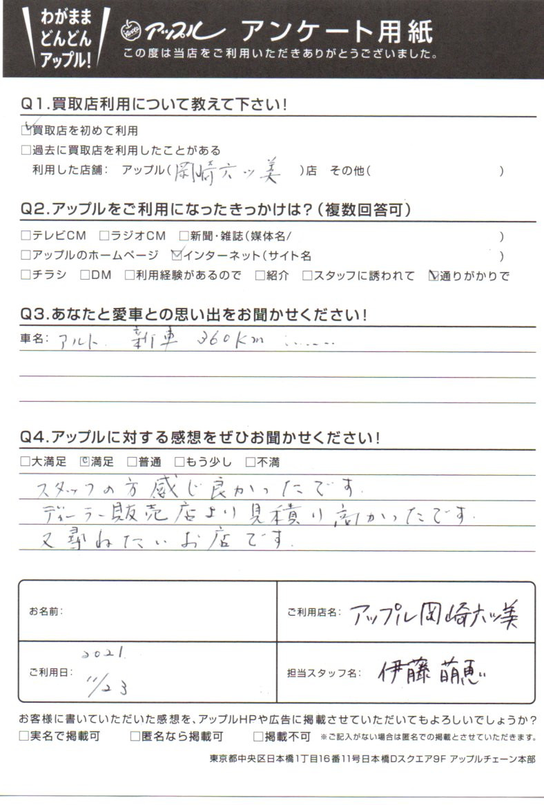 お車のご相談・ 査定だけでもOK! カンタン 入力 30秒 アップルがブランド買取始めました! お電話でも受付中! 受付時間10:00 ~ 19:00 (第4・第5月曜日は18:00閉店の場合あり) 0564-58-1700 お車のご相談・ 査定だけでもOK! カンタン 入力 30秒 アップルがブランド買取始めました! お電話でも受付中! 受付時間10:00 ~ 19:00 (第4・第5月曜日は18:00閉店の場合あり) 0564-58-1700 アップルがブランド買取始めました! お電話でも受付中! 受付時間10:00 ~ 19:00 (第4・第5月曜日は18:00閉店の場合あり) 0564-58-1700 店舗情報 在庫車 スタッフ紹介 ブログ お客様の声 キャンペーン 無料査定 click お客様の声 ご記入日: 2021/11/23 愛知県 匿名希望様 車名:スズキ アルト (2015年12月以降のワークス含む) スタッフの方感じ良かったです。ディーラー販売店より見積り高かったです。又尋ねたいお店です。 前へ 次へ お客様の声一覧を見る