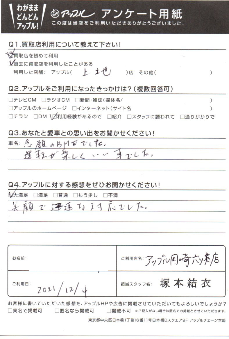 お車のご相談・ 査定だけでもOK! カンタン 入力 30秒 アップルがブランド買取始めました! お電話でも受付中! 受付時間10:00 ~ 19:00 (第4・第5月曜日は18:00閉店の場合あり) 0564-58-1700 お車のご相談・ 査定だけでもOK! カンタン 入力 30秒 アップルがブランド買取始めました! お電話でも受付中! 受付時間10:00 ~ 19:00 (第4・第5月曜日は18:00閉店の場合あり) 0564-58-1700 アップルがブランド買取始めました! お電話でも受付中! 受付時間10:00 ~ 19:00 (第4・第5月曜日は18:00閉店の場合あり) 0564-58-1700 店舗情報 在庫車 スタッフ紹介 ブログ お客様の声 キャンペーン 無料査定 click お客様の声 ご記入日: 2021/12/04 愛知県 匿名希望様 笑顔で迅速な対応でした。 前へ 次へ お客様の声一覧を見る
