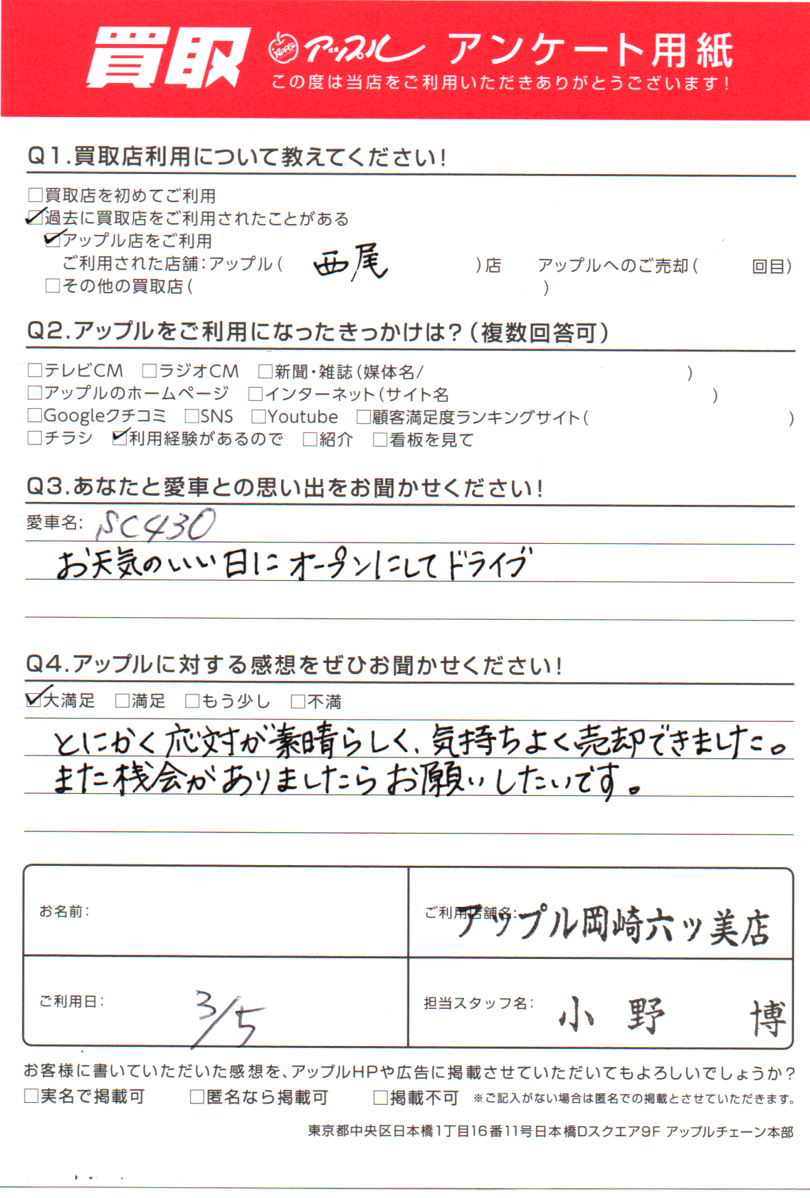 お車のご相談・ 査定だけでもOK! カンタン 入力 30秒 アップルがブランド買取始めました! お電話でも受付中! 受付時間10:00 ~ 19:00 (第4・第5月曜日は18:00閉店の場合あり) 0564-58-1700 お車のご相談・ 査定だけでもOK! カンタン 入力 30秒 アップルがブランド買取始めました! お電話でも受付中! 受付時間10:00 ~ 19:00 (第4・第5月曜日は18:00閉店の場合あり) 0564-58-1700 アップルがブランド買取始めました! お電話でも受付中! 受付時間10:00 ~ 19:00 (第4・第5月曜日は18:00閉店の場合あり) 0564-58-1700 店舗情報 在庫車 スタッフ紹介 ブログ お客様の声 キャンペーン 無料査定 click お客様の声 ご記入日: 2022/03/05 愛知県 匿名希望様 車名:レクサス SC (国内仕様 右H) とにかく対応が素晴らしく、気持ちよく売却できました。また機会がありましたらお願いしたいです。 前へ 次へ お客様の声一覧を見る