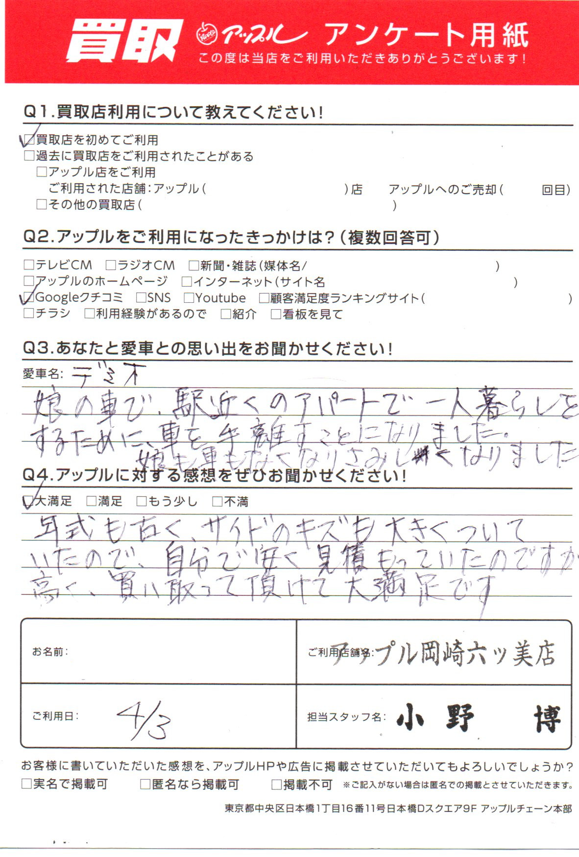 お車のご相談・ 査定だけでもOK! カンタン 入力 30秒 アップルがブランド買取始めました! お電話でも受付中! 受付時間10:00 ~ 19:00 (第4・第5月曜日は18:00閉店の場合あり) 0564-58-1700 お車のご相談・ 査定だけでもOK! カンタン 入力 30秒 アップルがブランド買取始めました! お電話でも受付中! 受付時間10:00 ~ 19:00 (第4・第5月曜日は18:00閉店の場合あり) 0564-58-1700 アップルがブランド買取始めました! お電話でも受付中! 受付時間10:00 ~ 19:00 (第4・第5月曜日は18:00閉店の場合あり) 0564-58-1700 店舗情報 在庫車 スタッフ紹介 ブログ お客様の声 キャンペーン 無料査定 click お客様の声 ご記入日: 2022/04/03 愛知県 匿名希望様 車名:マツダ デミオ 年式も古く、サイドのキズも大きくついていたので、自分で安く見積もっていたのですが、高く買い取って頂けて大満足です。 前へ 次へ お客様の声一覧を見る