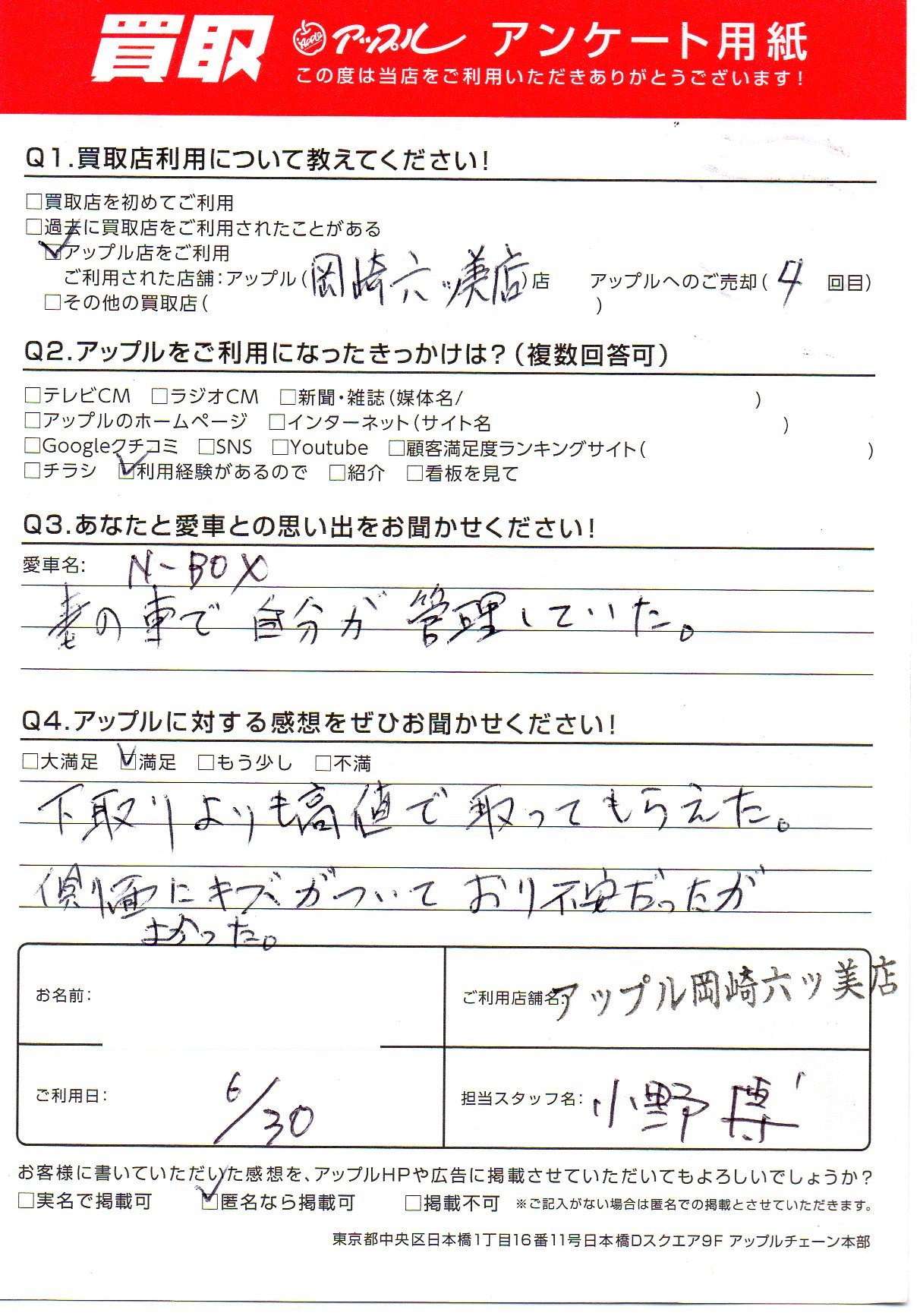 お車のご相談・ 査定だけでもOK! カンタン 入力 30秒 アップルがブランド買取始めました! お電話でも受付中! 受付時間10:00 ~ 19:00 (第4・第5月曜日は18:00閉店の場合あり) 0564-58-1700 お車のご相談・ 査定だけでもOK! カンタン 入力 30秒 アップルがブランド買取始めました! お電話でも受付中! 受付時間10:00 ~ 19:00 (第4・第5月曜日は18:00閉店の場合あり) 0564-58-1700 アップルがブランド買取始めました! お電話でも受付中! 受付時間10:00 ~ 19:00 (第4・第5月曜日は18:00閉店の場合あり) 0564-58-1700 店舗情報 在庫車 スタッフ紹介 ブログ お客様の声 キャンペーン 無料査定 click お客様の声 ご記入日: 2022/06/30 愛知県 匿名希望様 車名:ホンダ N-BOX 下取りよりも高値で取ってもらった。側面にキズがついており不安だったがよかった。 前へ 次へ お客様の声一覧を見る