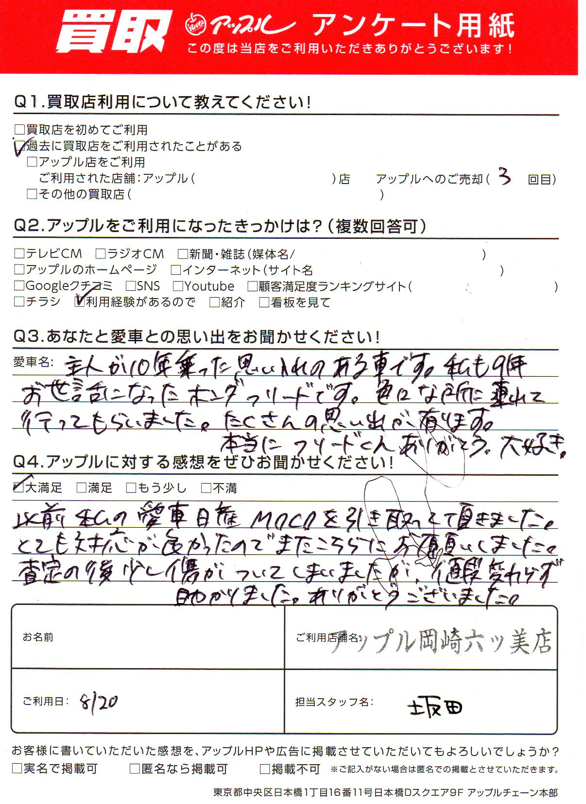 以前私の愛車日産MOCOを引き取って頂きました。とても対応が良かったのでまたこちらにお願いしました。査定の後、少し傷がついてしまいましたが、値段変わらず助かりました。ありがとうございました。