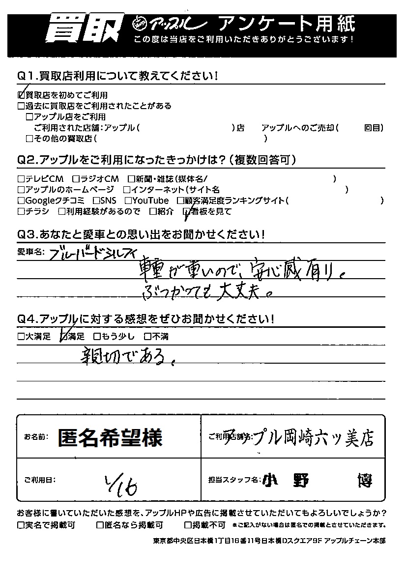 匿名希望様 車名:日産 ブルーバードシルフィ シルフィ(ブルーバード)