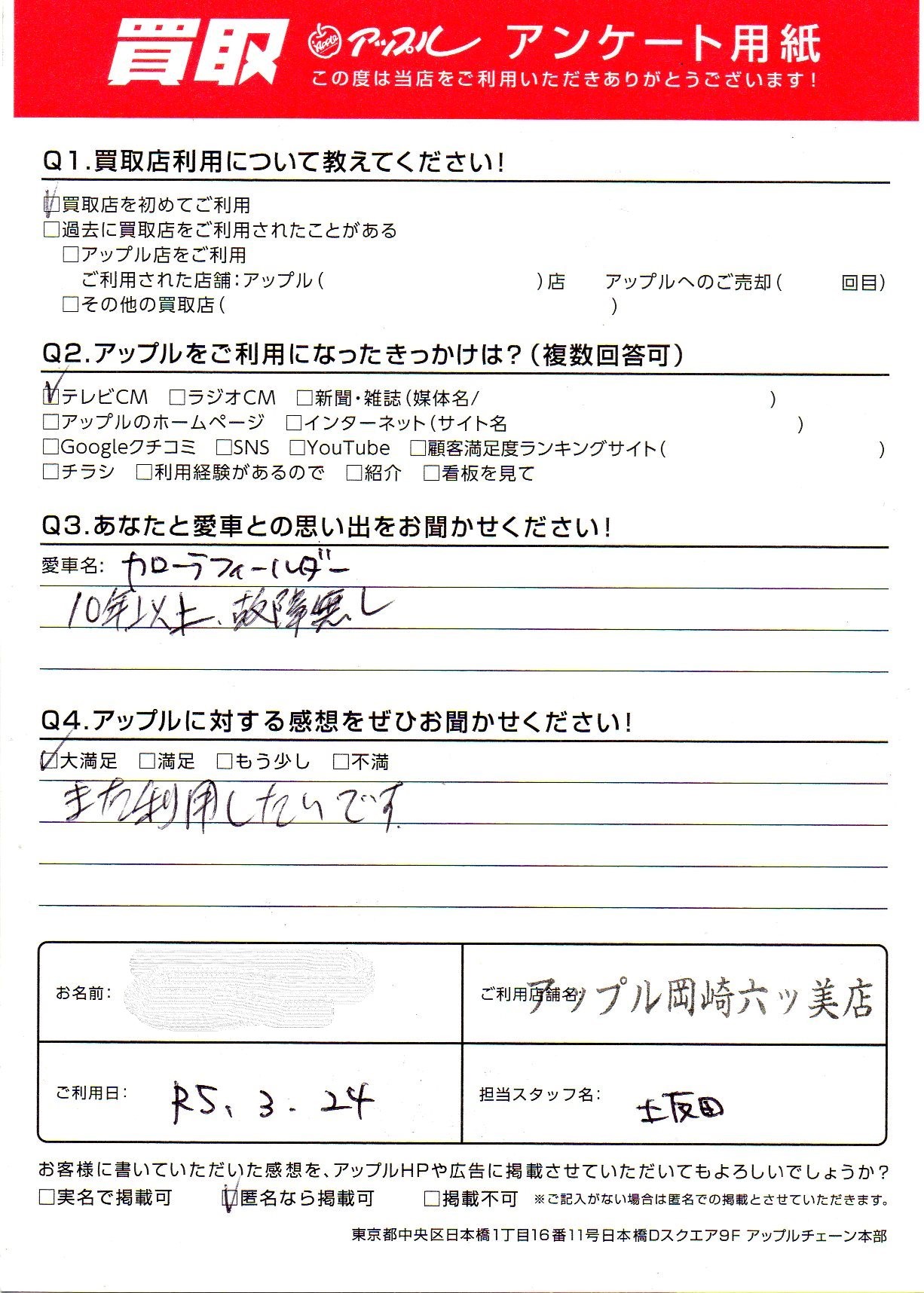 お車のご相談・ 査定だけでもOK! カンタン 入力 30秒 アップルがブランド買取始めました! お電話でも受付中! 受付時間10:00 ~ 19:00 (第4・第5月曜日は18:00閉店の場合あり) 0564-58-1700 お車のご相談・ 査定だけでもOK! カンタン 入力 30秒 アップルがブランド買取始めました! お電話でも受付中! 受付時間10:00 ~ 19:00 (第4・第5月曜日は18:00閉店の場合あり) 0564-58-1700 アップルがブランド買取始めました! お電話でも受付中! 受付時間10:00 ~ 19:00 (第4・第5月曜日は18:00閉店の場合あり) 0564-58-1700 店舗情報 在庫車 スタッフ紹介 ブログ お客様の声 キャンペーン 無料査定 click お客様の声 ご記入日: 2023/03/24 匿名希望様 車名:トヨタ カローラフィールダー フィールダー(カローラ) また利用したいです 前へ 次へ お客様の声一覧を見る