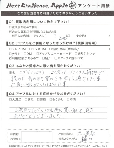 お車のご相談・ 査定だけでもOK! カンタン 入力 30秒 アップルがブランド買取始めました! お電話でも受付中! 受付時間10:00 ~ 19:00 (第4・第5月曜日は18:00閉店の場合あり) 0564-58-1700 お車のご相談・ 査定だけでもOK! カンタン 入力 30秒 アップルがブランド買取始めました! お電話でも受付中! 受付時間10:00 ~ 19:00 (第4・第5月曜日は18:00閉店の場合あり) 0564-58-1700 アップルがブランド買取始めました! お電話でも受付中! 受付時間10:00 ~ 19:00 (第4・第5月曜日は18:00閉店の場合あり) 0564-58-1700 店舗情報 在庫車 スタッフ紹介 ブログ お客様の声 キャンペーン 無料査定 click お客様の声 ご記入日: 2015/04/05 0様 2度目ですがいつも高く買い取っていただきありがとうございました。 前へ 次へ お客様の声一覧を見る