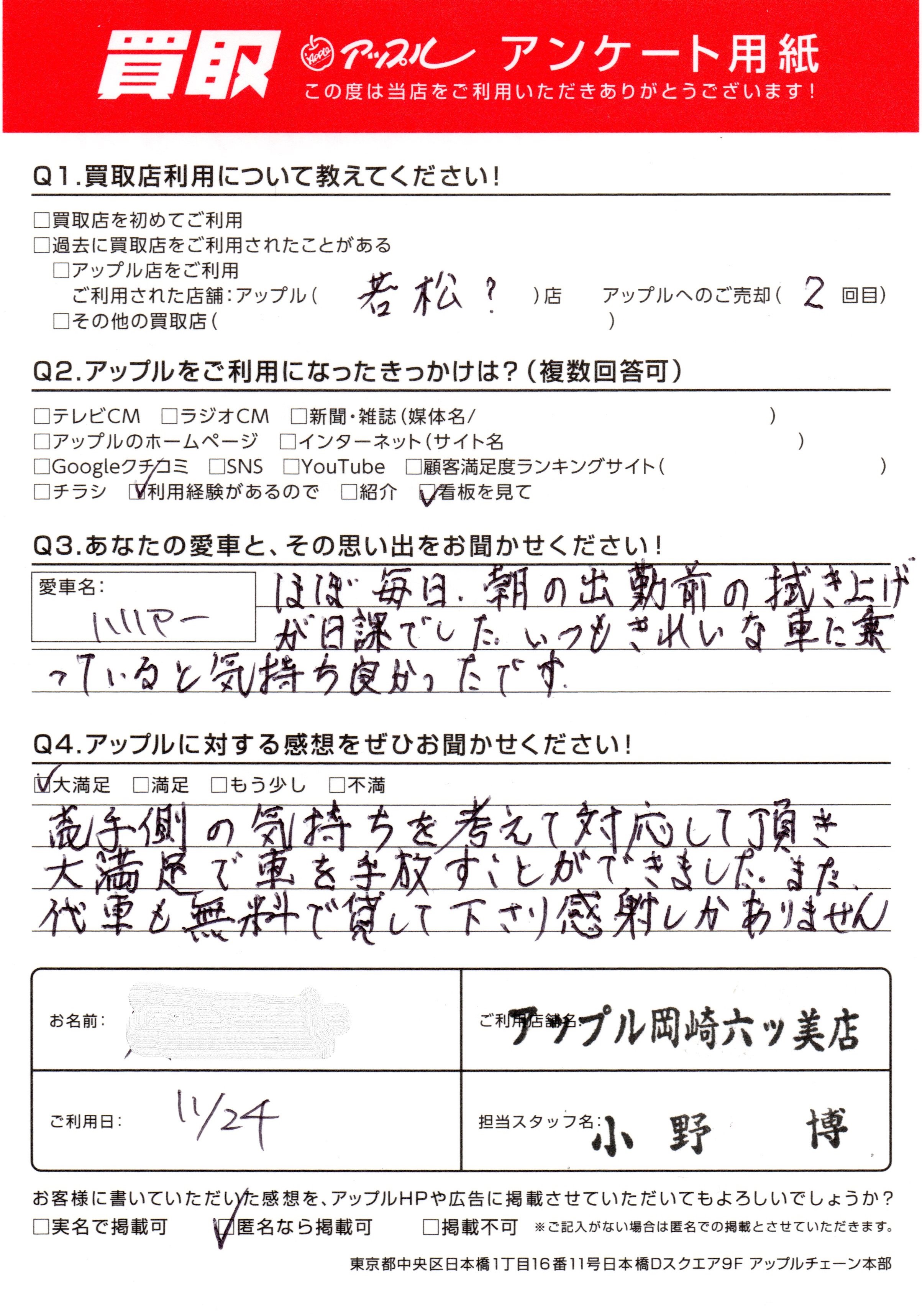お車のご相談・ 査定だけでもOK! カンタン 入力 30秒 アップルがブランド買取始めました! お電話でも受付中! 受付時間10:00 ~ 19:00 (第4・第5月曜日は18:00閉店の場合あり) 0564-58-1700 お車のご相談・ 査定だけでもOK! カンタン 入力 30秒 アップルがブランド買取始めました! お電話でも受付中! 受付時間10:00 ~ 19:00 (第4・第5月曜日は18:00閉店の場合あり) 0564-58-1700 アップルがブランド買取始めました! お電話でも受付中! 受付時間10:00 ~ 19:00 (第4・第5月曜日は18:00閉店の場合あり) 0564-58-1700 店舗情報 在庫車 スタッフ紹介 ブログ お客様の声 キャンペーン 無料査定 click お客様の声 ご記入日: 2024/11/24 S様 車名:トヨタ ハリアー (H25年12月~のハイブリッド含む) 売手側の気持ちを考えて対応して頂き大満足で車を手放すことができました。また代車も無料で貸して下さり感謝しかありません 前へ 次へ お客様の声一覧を見る