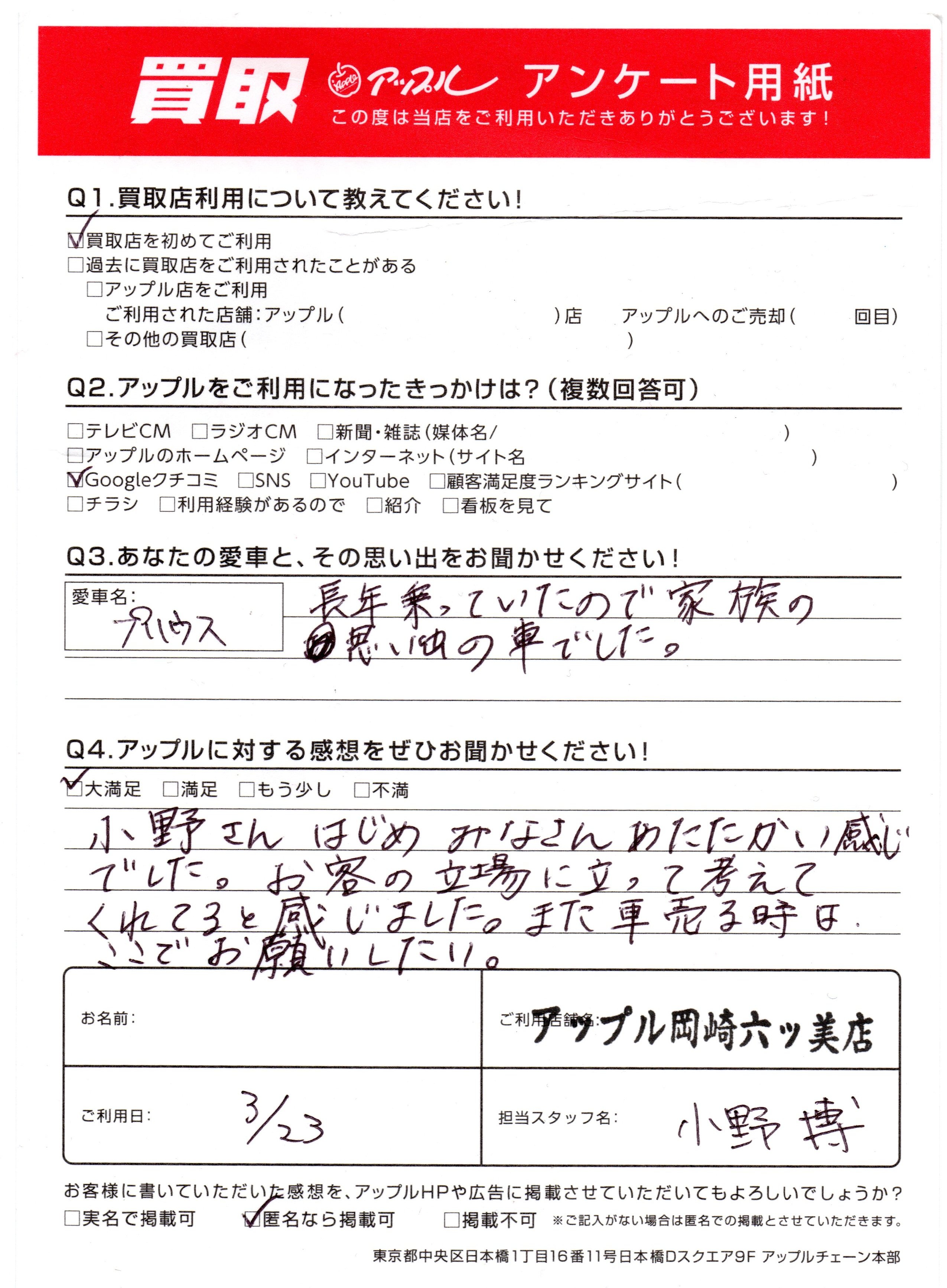 お車のご相談・ 査定だけでもOK! カンタン 入力 30秒 アップルがブランド買取始めました! お電話でも受付中! 受付時間10:00 ~ 19:00 (第4・第5月曜日は18:00閉店の場合あり) 0564-58-1700 お車のご相談・ 査定だけでもOK! カンタン 入力 30秒 アップルがブランド買取始めました! お電話でも受付中! 受付時間10:00 ~ 19:00 (第4・第5月曜日は18:00閉店の場合あり) 0564-58-1700 アップルがブランド買取始めました! お電話でも受付中! 受付時間10:00 ~ 19:00 (第4・第5月曜日は18:00閉店の場合あり) 0564-58-1700 店舗情報 在庫車 スタッフ紹介 ブログ お客様の声 キャンペーン お得 無料査定 click お客様の声 ご記入日: 2025/03/23 H様 車名:トヨタ プリウス(2023年3月~のPHVを含む) 小野さんはじめみなさんあたたかい感じでした。お客の立場に立って考えてくれてると感じました。また車売る時はここでお願いしたい。 前へ 次へ お客様の声一覧を見る