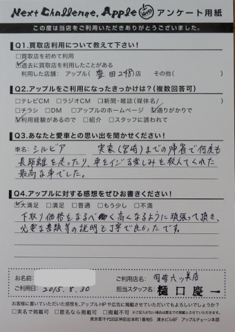 お車のご相談・ 査定だけでもOK! カンタン 入力 30秒 アップルがブランド買取始めました! お電話でも受付中! 受付時間10:00 ~ 19:00 (第4・第5月曜日は18:00閉店の場合あり) 0564-58-1700 お車のご相談・ 査定だけでもOK! カンタン 入力 30秒 アップルがブランド買取始めました! お電話でも受付中! 受付時間10:00 ~ 19:00 (第4・第5月曜日は18:00閉店の場合あり) 0564-58-1700 アップルがブランド買取始めました! お電話でも受付中! 受付時間10:00 ~ 19:00 (第4・第5月曜日は18:00閉店の場合あり) 0564-58-1700 店舗情報 在庫車 スタッフ紹介 ブログ お客様の声 キャンペーン 無料査定 click お客様の声 ご記入日: 2015/08/30 T様 下取り価格をなるべく高くなるように頑張って頂き、必要な書類等の説明も丁寧で良かったです。 前へ 次へ お客様の声一覧を見る