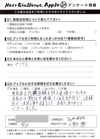 お車のご相談・ 査定だけでもOK! カンタン 入力 30秒 アップルがブランド買取始めました! お電話でも受付中! 受付時間10:00 ~ 19:00 (第4・第5月曜日は18:00閉店の場合あり) 0564-58-1700 お車のご相談・ 査定だけでもOK! カンタン 入力 30秒 アップルがブランド買取始めました! お電話でも受付中! 受付時間10:00 ~ 19:00 (第4・第5月曜日は18:00閉店の場合あり) 0564-58-1700 アップルがブランド買取始めました! お電話でも受付中! 受付時間10:00 ~ 19:00 (第4・第5月曜日は18:00閉店の場合あり) 0564-58-1700 店舗情報 在庫車 スタッフ紹介 ブログ お客様の声 キャンペーン 無料査定 click お客様の声 ご記入日: 2015/09/13 K様 買取店を何店舗も回る覚悟でいましたが店長の小野さんががんばってくれたおかげで、1店舗目で決める事が出来ました。本当にありがとうございました。 前へ 次へ お客様の声一覧を見る