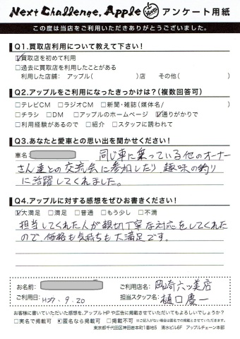 お車のご相談・ 査定だけでもOK! カンタン 入力 30秒 アップルがブランド買取始めました! お電話でも受付中! 受付時間10:00 ~ 19:00 (第4・第5月曜日は18:00閉店の場合あり) 0564-58-1700 お車のご相談・ 査定だけでもOK! カンタン 入力 30秒 アップルがブランド買取始めました! お電話でも受付中! 受付時間10:00 ~ 19:00 (第4・第5月曜日は18:00閉店の場合あり) 0564-58-1700 アップルがブランド買取始めました! お電話でも受付中! 受付時間10:00 ~ 19:00 (第4・第5月曜日は18:00閉店の場合あり) 0564-58-1700 店舗情報 在庫車 スタッフ紹介 ブログ お客様の声 キャンペーン 無料査定 click お客様の声 ご記入日: 2015/09/20 T様 担当してくれた人が親切丁寧な対応をしてくれたので、価格も気持ちも大満足です。 前へ 次へ お客様の声一覧を見る