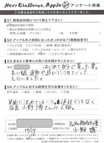 お車のご相談・ 査定だけでもOK! カンタン 入力 30秒 アップルがブランド買取始めました! お電話でも受付中! 受付時間10:00 ~ 19:00 (第4・第5月曜日は18:00閉店の場合あり) 0564-58-1700 お車のご相談・ 査定だけでもOK! カンタン 入力 30秒 アップルがブランド買取始めました! お電話でも受付中! 受付時間10:00 ~ 19:00 (第4・第5月曜日は18:00閉店の場合あり) 0564-58-1700 アップルがブランド買取始めました! お電話でも受付中! 受付時間10:00 ~ 19:00 (第4・第5月曜日は18:00閉店の場合あり) 0564-58-1700 店舗情報 在庫車 スタッフ紹介 ブログ お客様の声 キャンペーン 無料査定 click お客様の声 ご記入日: 2015/10/17 F様 単純に決めては一つ。値段ではなく店長 小野博さんの人柄。 前へ 次へ お客様の声一覧を見る