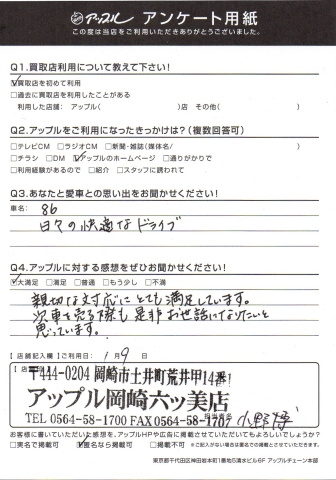 お車のご相談・ 査定だけでもOK! カンタン 入力 30秒 アップルがブランド買取始めました! お電話でも受付中! 受付時間10:00 ~ 19:00 (第4・第5月曜日は18:00閉店の場合あり) 0564-58-1700 お車のご相談・ 査定だけでもOK! カンタン 入力 30秒 アップルがブランド買取始めました! お電話でも受付中! 受付時間10:00 ~ 19:00 (第4・第5月曜日は18:00閉店の場合あり) 0564-58-1700 アップルがブランド買取始めました! お電話でも受付中! 受付時間10:00 ~ 19:00 (第4・第5月曜日は18:00閉店の場合あり) 0564-58-1700 店舗情報 在庫車 スタッフ紹介 ブログ お客様の声 キャンペーン 無料査定 click お客様の声 ご記入日: 2016/01/09 0様 親切な対応にとても満足しています。次車を売る際も是非お世話になりたいと思っています。 前へ 次へ お客様の声一覧を見る