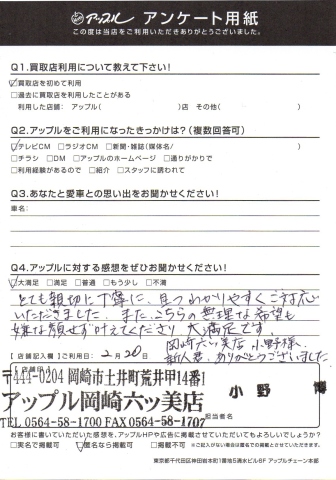 お車のご相談・ 査定だけでもOK! カンタン 入力 30秒 アップルがブランド買取始めました! お電話でも受付中! 受付時間10:00 ~ 19:00 (第4・第5月曜日は18:00閉店の場合あり) 0564-58-1700 お車のご相談・ 査定だけでもOK! カンタン 入力 30秒 アップルがブランド買取始めました! お電話でも受付中! 受付時間10:00 ~ 19:00 (第4・第5月曜日は18:00閉店の場合あり) 0564-58-1700 アップルがブランド買取始めました! お電話でも受付中! 受付時間10:00 ~ 19:00 (第4・第5月曜日は18:00閉店の場合あり) 0564-58-1700 店舗情報 在庫車 スタッフ紹介 ブログ お客様の声 キャンペーン 無料査定 click お客様の声 ご記入日: 2016/02/20 O.S様 とても親切に丁寧に、且つわかりやすくご対応いただきました。また、こちらの無理な希望も嫌な顔せずに叶えてくださいました。大満足です。岡崎六ッ美店 小野様新人君、ありがとうございました。 前へ 次へ お客様の声一覧を見る