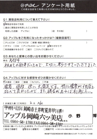 お車のご相談・ 査定だけでもOK! カンタン 入力 30秒 アップルがブランド買取始めました! お電話でも受付中! 受付時間10:00 ~ 19:00 (第4・第5月曜日は18:00閉店の場合あり) 0564-58-1700 お車のご相談・ 査定だけでもOK! カンタン 入力 30秒 アップルがブランド買取始めました! お電話でも受付中! 受付時間10:00 ~ 19:00 (第4・第5月曜日は18:00閉店の場合あり) 0564-58-1700 アップルがブランド買取始めました! お電話でも受付中! 受付時間10:00 ~ 19:00 (第4・第5月曜日は18:00閉店の場合あり) 0564-58-1700 店舗情報 在庫車 スタッフ紹介 ブログ お客様の声 キャンペーン 無料査定 click お客様の声 ご記入日: 2016/02/26 I.N様 接客、値段、共に大満足です。特に接客が他店と比べて良かったので、また機会があれば利用したい。 前へ 次へ お客様の声一覧を見る
