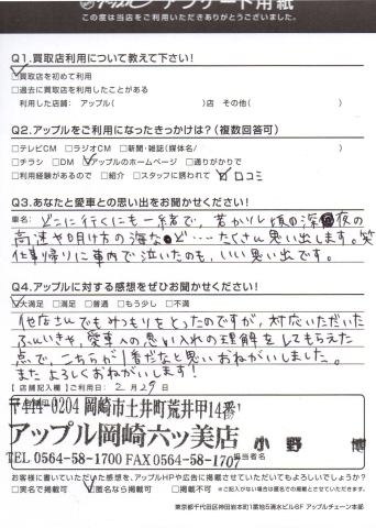 お車のご相談・ 査定だけでもOK! カンタン 入力 30秒 アップルがブランド買取始めました! お電話でも受付中! 受付時間10:00 ~ 19:00 (第4・第5月曜日は18:00閉店の場合あり) 0564-58-1700 お車のご相談・ 査定だけでもOK! カンタン 入力 30秒 アップルがブランド買取始めました! お電話でも受付中! 受付時間10:00 ~ 19:00 (第4・第5月曜日は18:00閉店の場合あり) 0564-58-1700 アップルがブランド買取始めました! お電話でも受付中! 受付時間10:00 ~ 19:00 (第4・第5月曜日は18:00閉店の場合あり) 0564-58-1700 店舗情報 在庫車 スタッフ紹介 ブログ お客様の声 キャンペーン 無料査定 click お客様の声 ご記入日: 2016/03/29 B.H様 他店さんでも見積をとったのですが、対応いただいたふんいきや、愛車への思い入れの理解をしてもらえた点で、こちらが一番だなと思いお願いしました。また、よろしくお願いします!「 前へ 次へ お客様の声一覧を見る