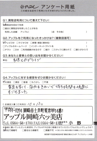 お車のご相談・ 査定だけでもOK! カンタン 入力 30秒 アップルがブランド買取始めました! お電話でも受付中! 受付時間10:00 ~ 19:00 (第4・第5月曜日は18:00閉店の場合あり) 0564-58-1700 お車のご相談・ 査定だけでもOK! カンタン 入力 30秒 アップルがブランド買取始めました! お電話でも受付中! 受付時間10:00 ~ 19:00 (第4・第5月曜日は18:00閉店の場合あり) 0564-58-1700 アップルがブランド買取始めました! お電話でも受付中! 受付時間10:00 ~ 19:00 (第4・第5月曜日は18:00閉店の場合あり) 0564-58-1700 店舗情報 在庫車 スタッフ紹介 ブログ お客様の声 キャンペーン 無料査定 click お客様の声 ご記入日: 2016/10/13 鳥居様 査定も早くて、店内もきれいで待ち時間も快適に過ごせました。 前へ 次へ お客様の声一覧を見る