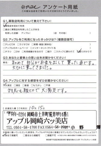 お車のご相談・ 査定だけでもOK! カンタン 入力 30秒 アップルがブランド買取始めました! お電話でも受付中! 受付時間10:00 ~ 19:00 (第4・第5月曜日は18:00閉店の場合あり) 0564-58-1700 お車のご相談・ 査定だけでもOK! カンタン 入力 30秒 アップルがブランド買取始めました! お電話でも受付中! 受付時間10:00 ~ 19:00 (第4・第5月曜日は18:00閉店の場合あり) 0564-58-1700 アップルがブランド買取始めました! お電話でも受付中! 受付時間10:00 ~ 19:00 (第4・第5月曜日は18:00閉店の場合あり) 0564-58-1700 店舗情報 在庫車 スタッフ紹介 ブログ お客様の声 キャンペーン 無料査定 click お客様の声 ご記入日: 2016/10/15 佐々木様 対応も親切で大満足です。 前へ 次へ お客様の声一覧を見る