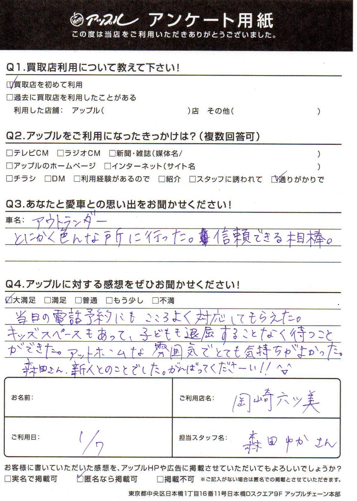 愛知県 匿名希望様 車名:三菱 アウトランダー