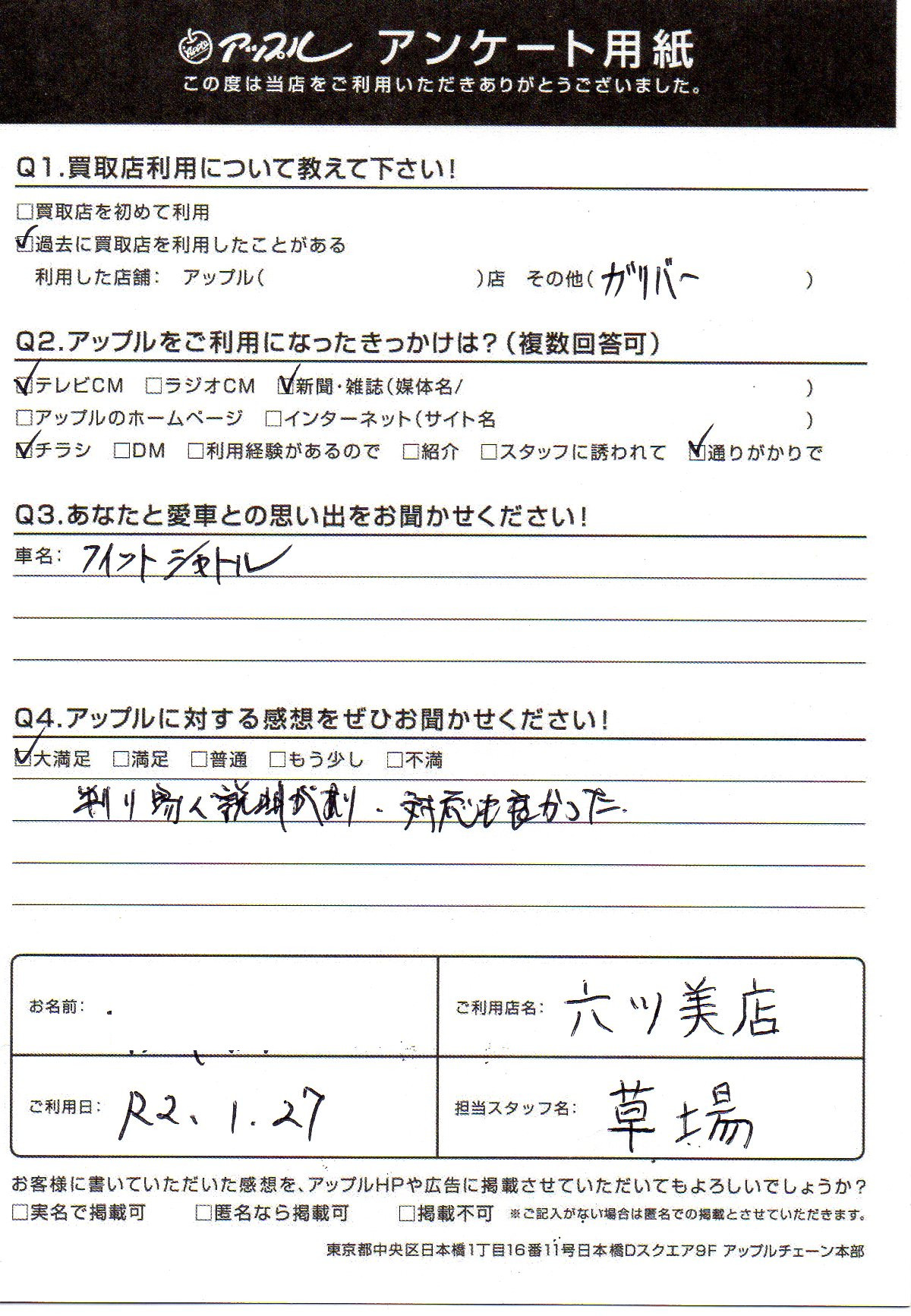 お車のご相談・ 査定だけでもOK! カンタン 入力 30秒 アップルがブランド買取始めました! お電話でも受付中! 受付時間10:00 ~ 19:00 (第4・第5月曜日は18:00閉店の場合あり) 0564-58-1700 お車のご相談・ 査定だけでもOK! カンタン 入力 30秒 アップルがブランド買取始めました! お電話でも受付中! 受付時間10:00 ~ 19:00 (第4・第5月曜日は18:00閉店の場合あり) 0564-58-1700 アップルがブランド買取始めました! お電話でも受付中! 受付時間10:00 ~ 19:00 (第4・第5月曜日は18:00閉店の場合あり) 0564-58-1700 店舗情報 在庫車 スタッフ紹介 ブログ お客様の声 キャンペーン 無料査定 click お客様の声 ご記入日: 2020/01/27 匿名希望様 車名:ホンダ フィットシャトル 判り易く説明があり、対応も良かった。 前へ 次へ お客様の声一覧を見る