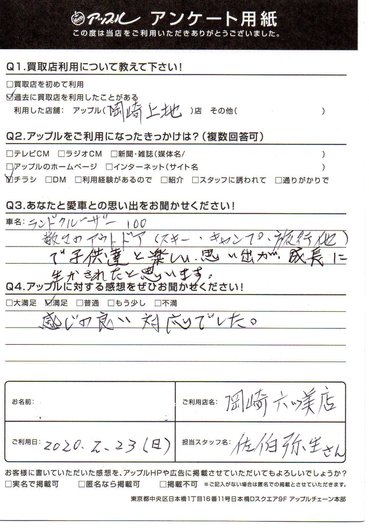 お車のご相談・ 査定だけでもOK! カンタン 入力 30秒 アップルがブランド買取始めました! お電話でも受付中! 受付時間10:00 ~ 19:00 (第4・第5月曜日は18:00閉店の場合あり) 0564-58-1700 お車のご相談・ 査定だけでもOK! カンタン 入力 30秒 アップルがブランド買取始めました! お電話でも受付中! 受付時間10:00 ~ 19:00 (第4・第5月曜日は18:00閉店の場合あり) 0564-58-1700 アップルがブランド買取始めました! お電話でも受付中! 受付時間10:00 ~ 19:00 (第4・第5月曜日は18:00閉店の場合あり) 0564-58-1700 店舗情報 在庫車 スタッフ紹介 ブログ お客様の声 キャンペーン 無料査定 click お客様の声 ご記入日: 2020/02/23 匿名希望様 車名:トヨタ ランドクルーザー100(H10年1月~H19年6月) 感じが良い対応でした。 前へ 次へ お客様の声一覧を見る