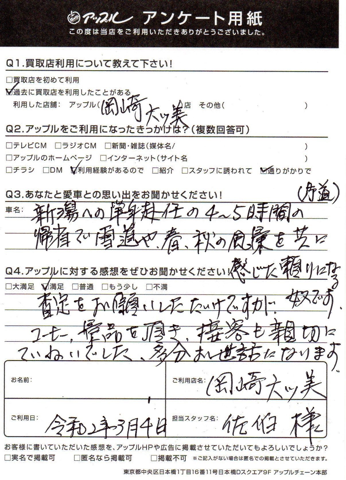 お車のご相談・ 査定だけでもOK! カンタン 入力 30秒 アップルがブランド買取始めました! お電話でも受付中! 受付時間10:00 ~ 19:00 (第4・第5月曜日は18:00閉店の場合あり) 0564-58-1700 お車のご相談・ 査定だけでもOK! カンタン 入力 30秒 アップルがブランド買取始めました! お電話でも受付中! 受付時間10:00 ~ 19:00 (第4・第5月曜日は18:00閉店の場合あり) 0564-58-1700 アップルがブランド買取始めました! お電話でも受付中! 受付時間10:00 ~ 19:00 (第4・第5月曜日は18:00閉店の場合あり) 0564-58-1700 店舗情報 在庫車 スタッフ紹介 ブログ お客様の声 キャンペーン 無料査定 click お客様の声 ご記入日: 2020/03/04 愛知県 匿名希望様 査定をお願いしただけですが、コーヒー、景品を頂き、接客も親切にていねいでした。多分お世話になります。 前へ 次へ お客様の声一覧を見る