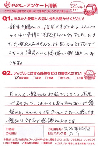 お車のご相談・ 査定だけでもOK! カンタン 入力 30秒 アップルがブランド買取始めました! お電話でも受付中! 受付時間10:00 ~ 19:00 (第4・第5月曜日は18:00閉店の場合あり) 0564-58-1700 お車のご相談・ 査定だけでもOK! カンタン 入力 30秒 アップルがブランド買取始めました! お電話でも受付中! 受付時間10:00 ~ 19:00 (第4・第5月曜日は18:00閉店の場合あり) 0564-58-1700 アップルがブランド買取始めました! お電話でも受付中! 受付時間10:00 ~ 19:00 (第4・第5月曜日は18:00閉店の場合あり) 0564-58-1700 店舗情報 在庫車 スタッフ紹介 ブログ お客様の声 キャンペーン 無料査定 click お客様の声 ご記入日: 2013/06/09 Y様 たいへん親切な対応でこちらも満足でありました。これからも私の知り合いで希望がありましたら紹介して行きたいと思います。親切な対応に感謝しております。 前へ 次へ お客様の声一覧を見る