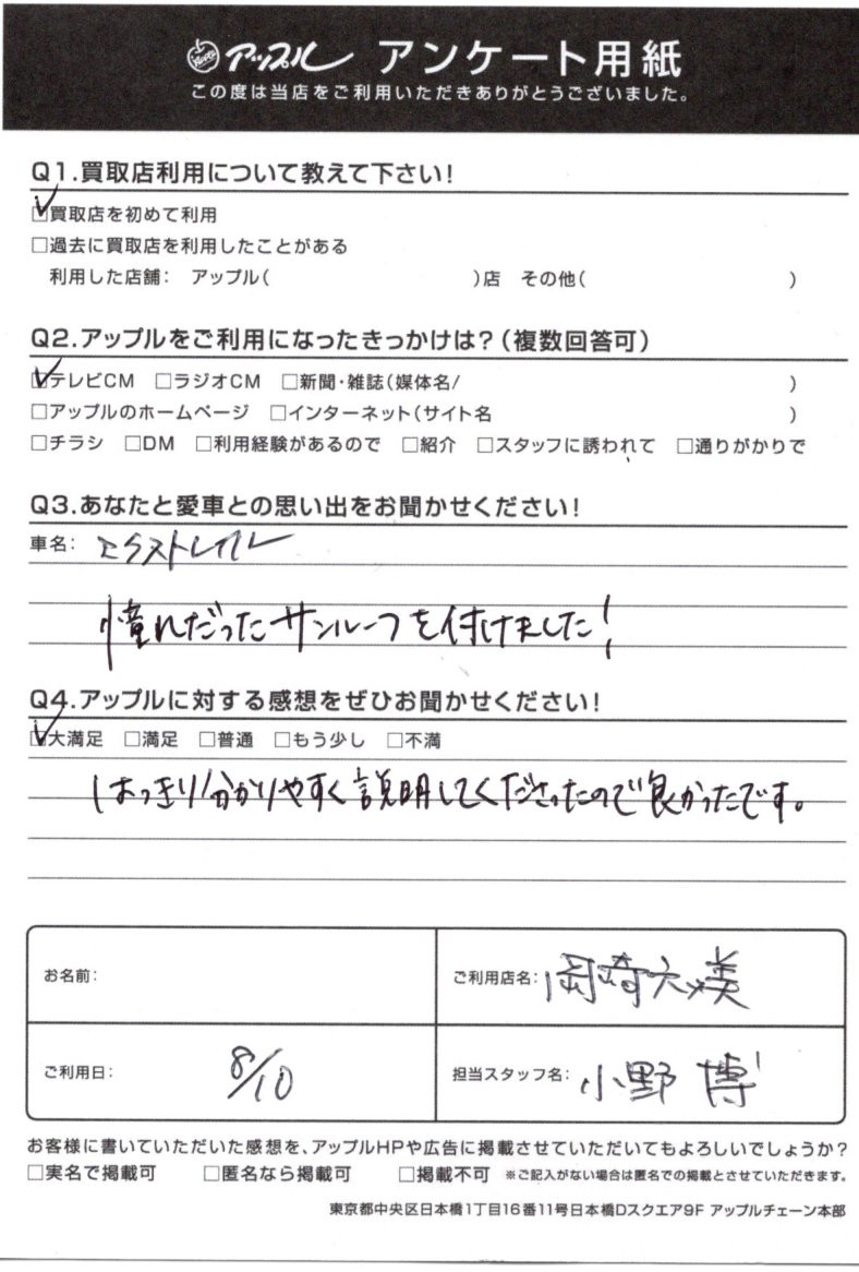 お車のご相談・ 査定だけでもOK! カンタン 入力 30秒 アップルがブランド買取始めました! お電話でも受付中! 受付時間10:00 ~ 19:00 (第4・第5月曜日は18:00閉店の場合あり) 0564-58-1700 お車のご相談・ 査定だけでもOK! カンタン 入力 30秒 アップルがブランド買取始めました! お電話でも受付中! 受付時間10:00 ~ 19:00 (第4・第5月曜日は18:00閉店の場合あり) 0564-58-1700 アップルがブランド買取始めました! お電話でも受付中! 受付時間10:00 ~ 19:00 (第4・第5月曜日は18:00閉店の場合あり) 0564-58-1700 店舗情報 在庫車 スタッフ紹介 ブログ お客様の声 キャンペーン 無料査定 click お客様の声 ご記入日: 2020/08/10 愛知県 匿名希望様 車名:日産 エクストレイル はっきり分かりやすく説明してくださったので良かったです。 前へ 次へ お客様の声一覧を見る