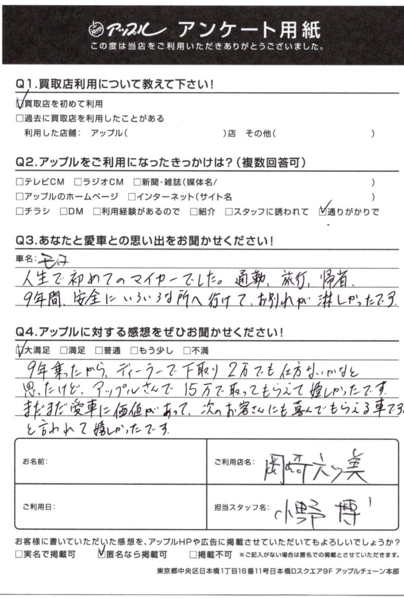 9年乗ったから、ディーラーで下取り2万でも仕方ないかなと思ったけど、アップルさんで15万で取ってもらえて嬉しかったです。まだまだ愛車に価値があって、次のお客さんにも喜んでもらえる車ですねと言われて嬉しかったです。