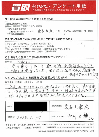 お車のご相談・ 査定だけでもOK! カンタン 入力 30秒 アップルがブランド買取始めました! お電話でも受付中! 受付時間10:00~19:00 0594-22-5777 お車のご相談・ 査定だけでもOK! カンタン 入力 30秒 アップルがブランド買取始めました! お電話でも受付中! 受付時間10:00~19:00 0594-22-5777 アップルがブランド買取始めました! お電話でも受付中! 受付時間10:00~19:00 0594-22-5777 店舗情報 在庫車 スタッフ紹介 ブログ お客様の声 キャンペーン お得 無料査定 click お客様の声 ご記入日: 2023/01/14 匿名希望様 車名:シボレー クルーズ 店長の中川さんの対応がとても良く車も家族の一員の様な言い方で本当に気持ち良かったです。他スタッフの方も気持ちよく迎えいれてくれました。 前へ 次へ お客様の声一覧を見る