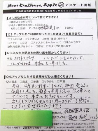 お車のご相談・ 査定だけでもOK! カンタン 入力 30秒 アップルがブランド買取始めました! お電話でも受付中! 受付時間10:00 ~ 18:30 0120-978-553 お車のご相談・ 査定だけでもOK! カンタン 入力 30秒 アップルがブランド買取始めました! お電話でも受付中! 受付時間10:00 ~ 18:30 0120-978-553 アップルがブランド買取始めました! お電話でも受付中! 受付時間10:00 ~ 18:30 0120-978-553 店舗情報 在庫車 スタッフ紹介 ブログ お客様の声 キャンペーン お得 無料査定 click お客様の声 ご記入日: 2015/04/10 Y様 ★愛車との思い出(スイフトスポーツ)ノンターボにも関らず、スムーズな加速、本当に良い車でした。★アップルへの感想今回、4度目の利用でしたが、毎回売る人の気持ちを考えた最良の売却方法や、次の車へのアドバイス、本当にありがたいです。次も(しばらく先になると思いますが…)絶対にこちらにお世話になります! 前へ 次へ お客様の声一覧を見る