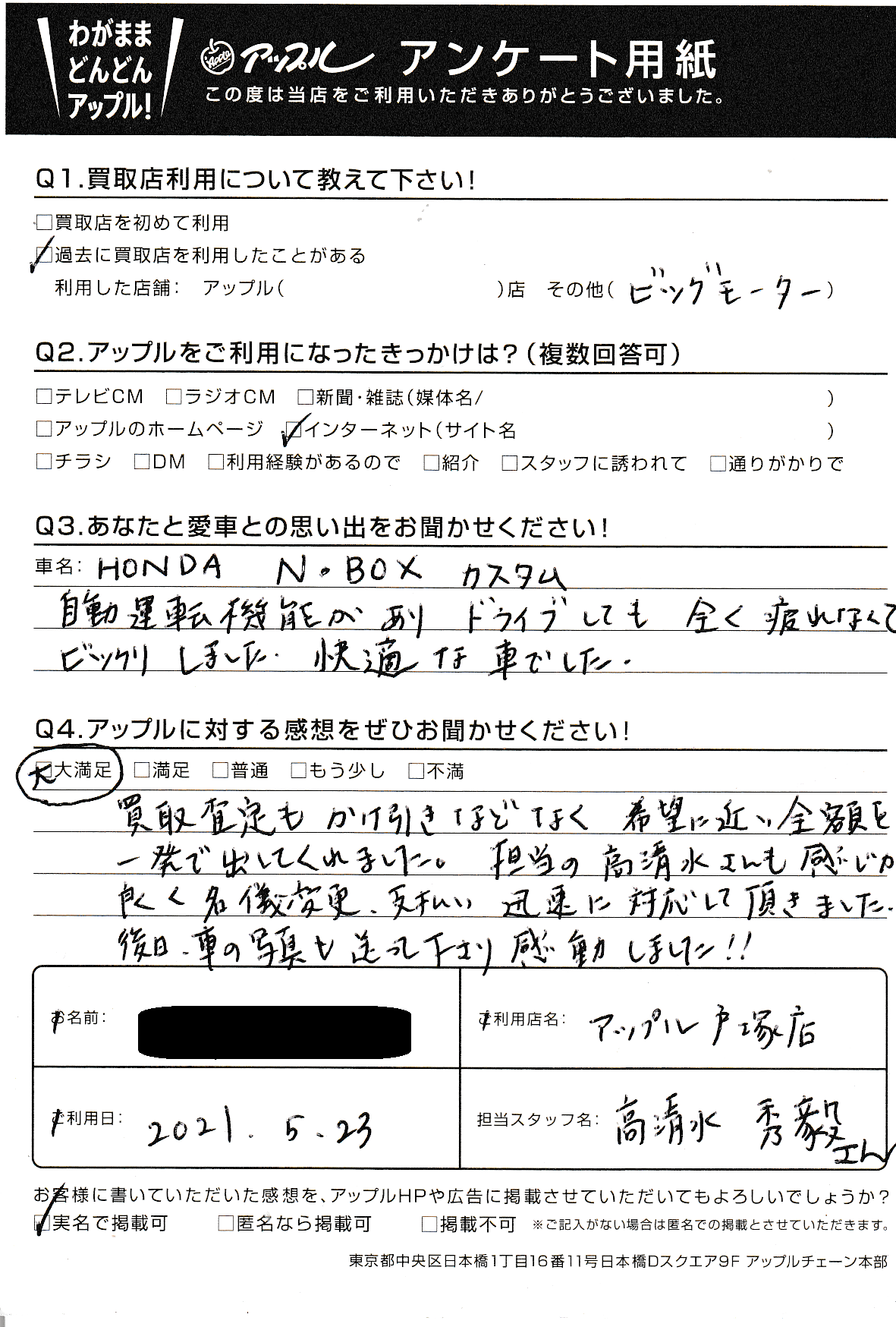 担当の高清水さんも感じが良く名義変更、支払い、迅速に対応して頂きました。