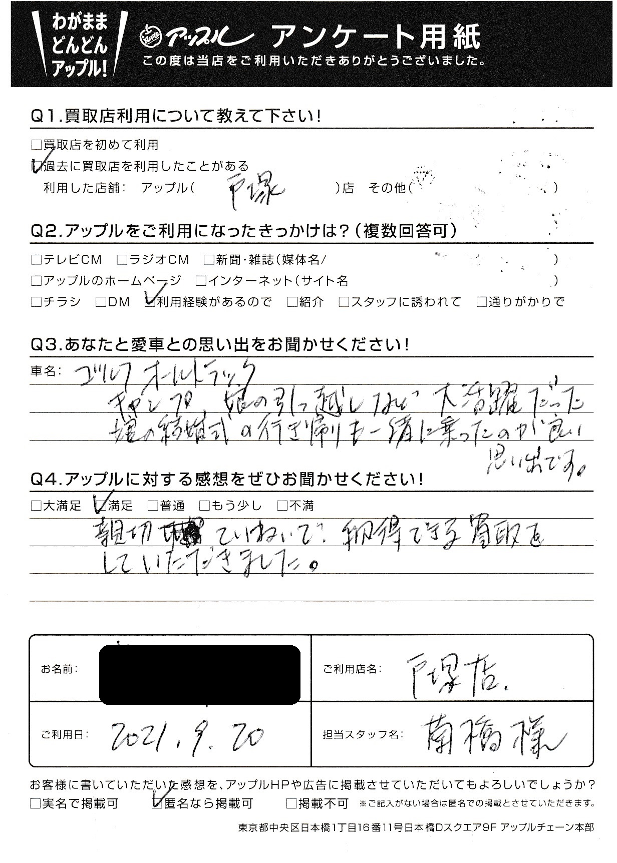 お車のご相談・ 査定だけでもOK! カンタン 入力 30秒 アップルがブランド買取始めました! お電話でも受付中! 受付時間10:00 ~ 19:00 045-828-2588 お車のご相談・ 査定だけでもOK! カンタン 入力 30秒 アップルがブランド買取始めました! お電話でも受付中! 受付時間10:00 ~ 19:00 045-828-2588 アップルがブランド買取始めました! お電話でも受付中! 受付時間10:00 ~ 19:00 045-828-2588 店舗情報 在庫車 スタッフ紹介 ブログ お客様の声 キャンペーン お得 無料査定 click お客様の声 ご記入日: 2021/09/20 H・K様 車名:フォルクスワーゲン ゴルフオールトラック 【あなたと愛車との思い出をお聞かせください】キャンプ娘の引っ越しなど大活躍だった。娘の結婚式の行き返りも一緒に乗ったのが良い思い出です。【アップルに対する感想をぜひお聞かせください】親切ていねいで、納得できる買取をしていただきました。 前へ 次へ お客様の声一覧を見る