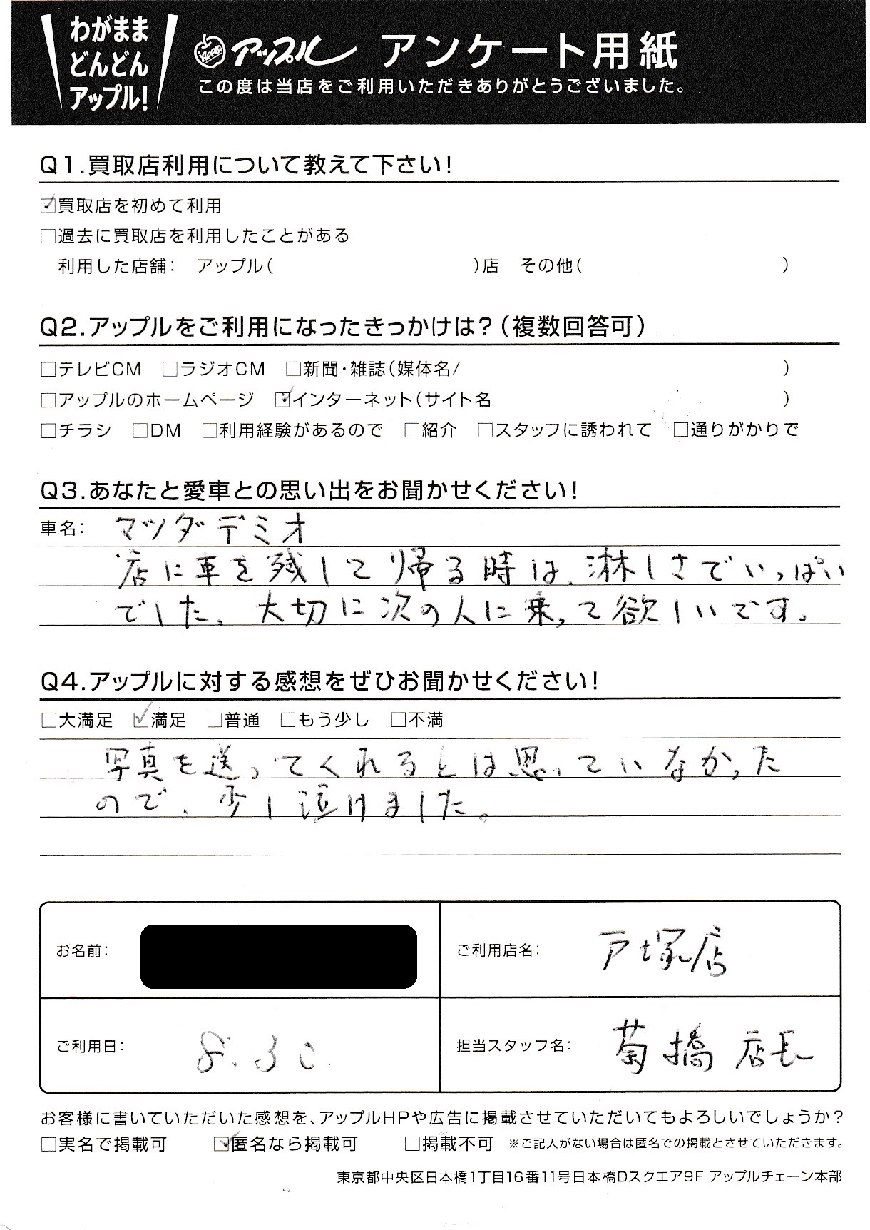 お車のご相談・ 査定だけでもOK! カンタン 入力 30秒 アップルがブランド買取始めました! お電話でも受付中! 受付時間10:00 ~ 19:00 045-828-2588 お車のご相談・ 査定だけでもOK! カンタン 入力 30秒 アップルがブランド買取始めました! お電話でも受付中! 受付時間10:00 ~ 19:00 045-828-2588 アップルがブランド買取始めました! お電話でも受付中! 受付時間10:00 ~ 19:00 045-828-2588 店舗情報 在庫車 スタッフ紹介 ブログ お客様の声 キャンペーン お得 無料査定 click お客様の声 ご記入日: 2021/08/30 Y・Y様 車名:マツダ デミオ 【あなたと愛車との思い出をお聞かせください】店に車を残して帰る時は淋しさでいっぱいでした。大切に次の人に乗って欲しいです。【アップルに対する感想をぜひお聞かせください】写真を送ってくれるとは思っていなかったので、少し泣けました。 前へ 次へ お客様の声一覧を見る