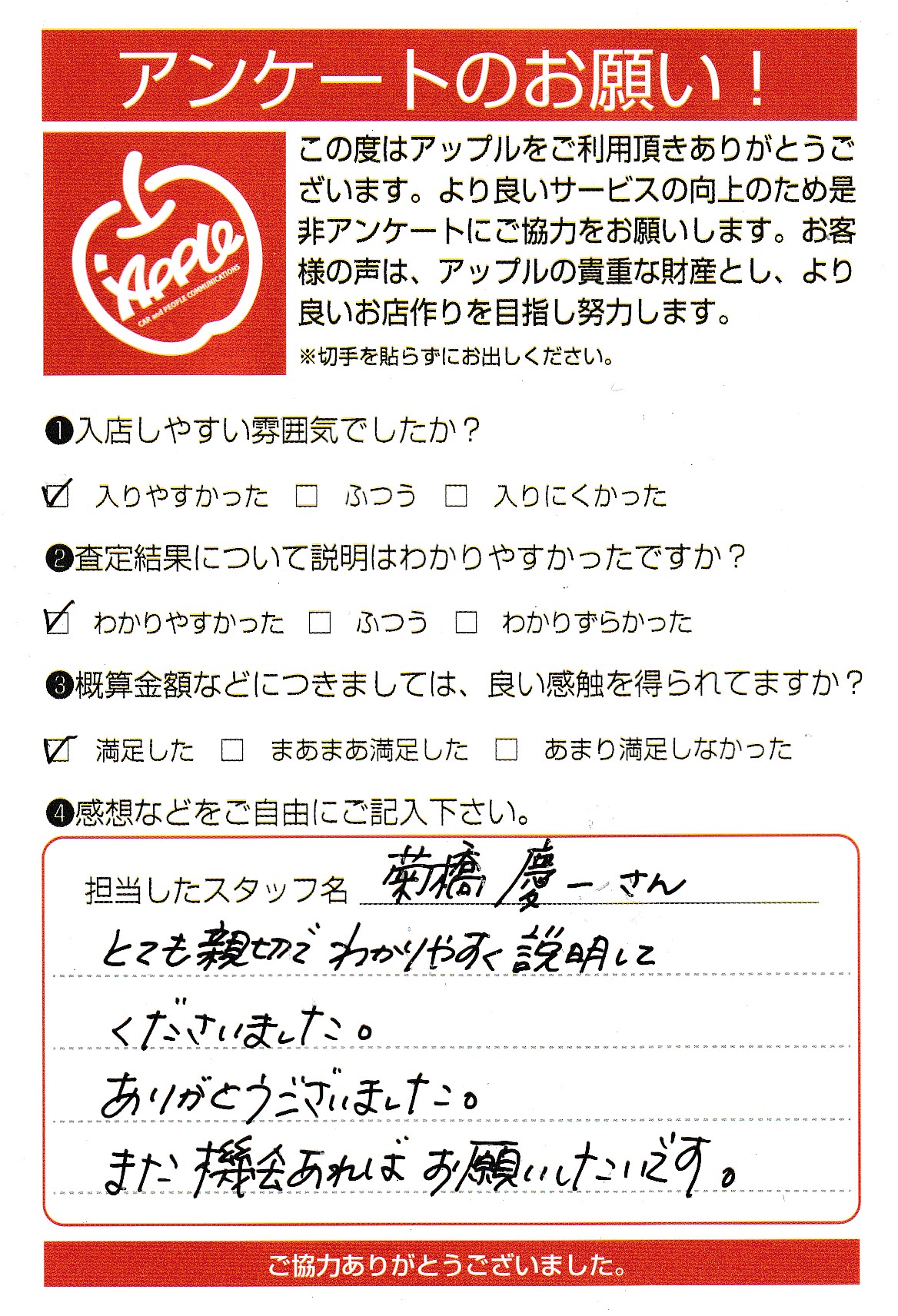 お車のご相談・ 査定だけでもOK! カンタン 入力 30秒 アップルがブランド買取始めました! お電話でも受付中! 受付時間10:00 ~ 19:00 045-828-2588 お車のご相談・ 査定だけでもOK! カンタン 入力 30秒 アップルがブランド買取始めました! お電話でも受付中! 受付時間10:00 ~ 19:00 045-828-2588 アップルがブランド買取始めました! お電話でも受付中! 受付時間10:00 ~ 19:00 045-828-2588 店舗情報 在庫車 スタッフ紹介 ブログ お客様の声 キャンペーン お得 無料査定 click お客様の声 ご記入日: 2022/03/17 J・K様 車名:スズキ エブリイ 【アップルに対する感想をぜひお聞かせください】とても親切でわかりやすく説明してくださいました。ありがとうございました。また機会あればお願いしたいです。 前へ 次へ お客様の声一覧を見る