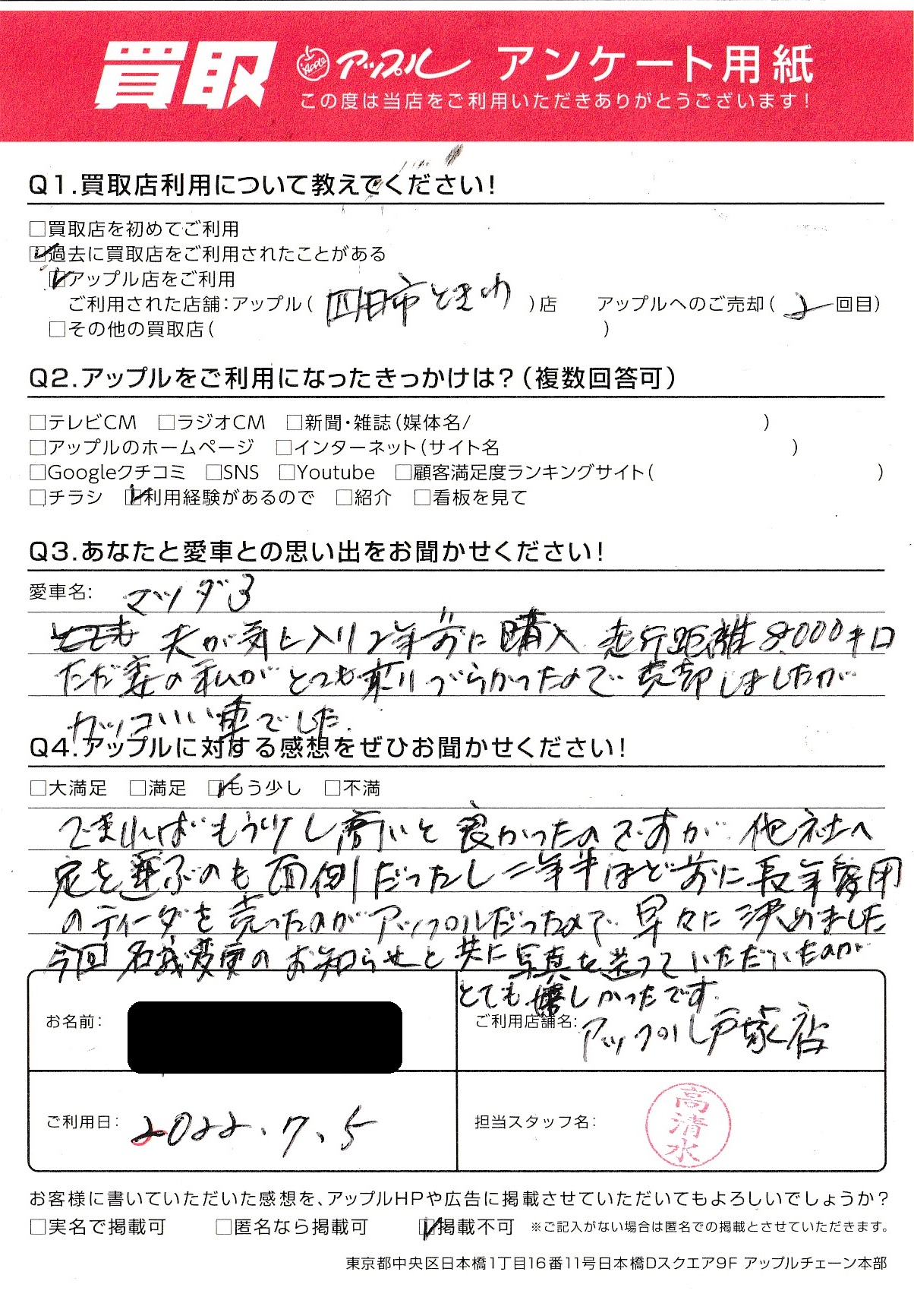 S・H様 車名:マツダ MAZDA3ファストバック