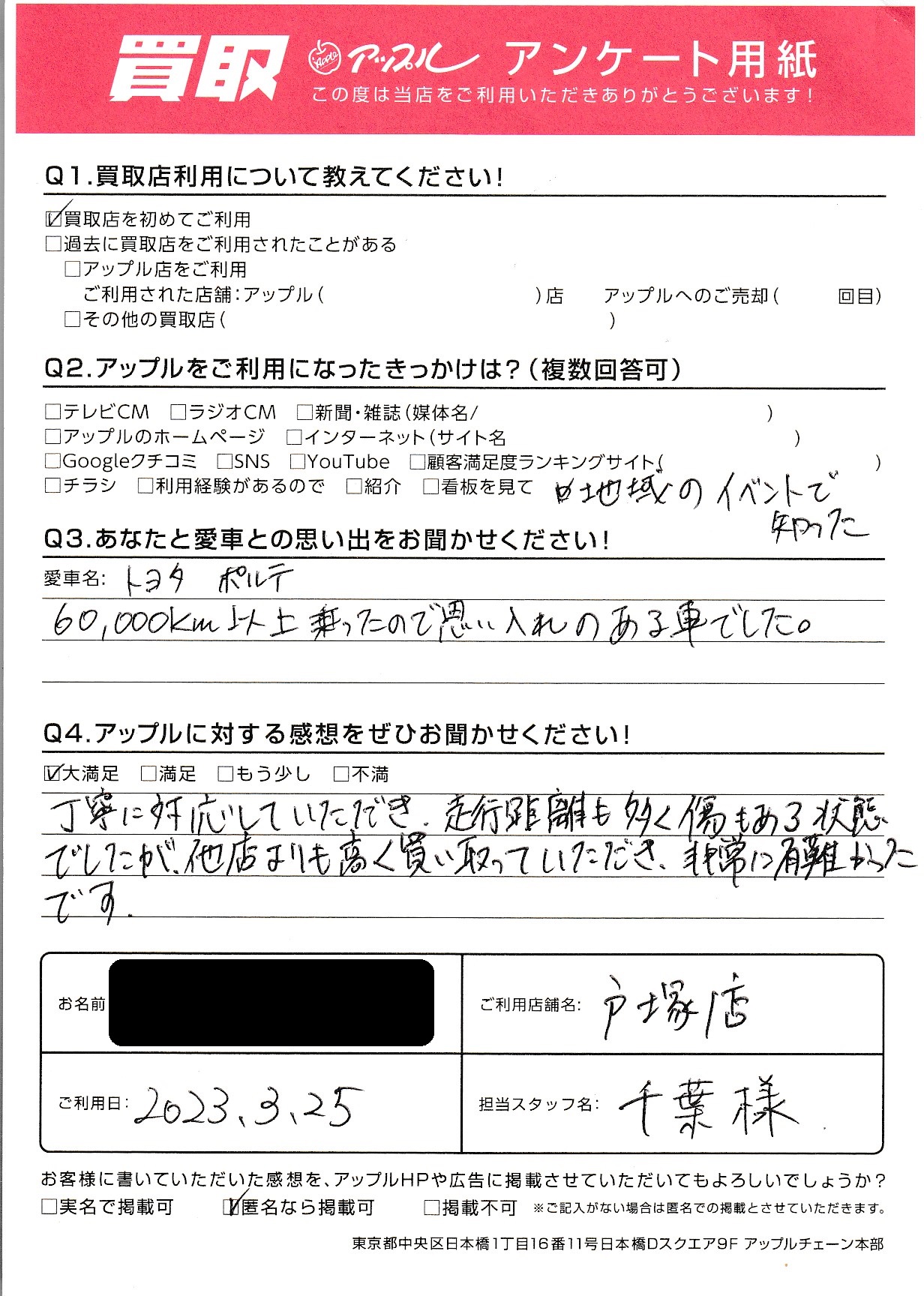 お車のご相談・ 査定だけでもOK! カンタン 入力 30秒 アップルがブランド買取始めました! お電話でも受付中! 受付時間10:00 ~ 19:00 045-828-2588 お車のご相談・ 査定だけでもOK! カンタン 入力 30秒 アップルがブランド買取始めました! お電話でも受付中! 受付時間10:00 ~ 19:00 045-828-2588 アップルがブランド買取始めました! お電話でも受付中! 受付時間10:00 ~ 19:00 045-828-2588 店舗情報 在庫車 スタッフ紹介 ブログ お客様の声 キャンペーン お得 無料査定 click お客様の声 ご記入日: 2023/03/25 S・S様 車名:トヨタ ポルテ 【あなたと愛車との思い出をお聞かせください】60.000km以上乗ったので思い入れのある車でした。【アップルに対する感想をぜひお聞かせください】丁寧に対応していただき、走行距離も多く傷もある状態でしたが他店よりも高く買い取っていただき、非常に有難かったです。 前へ 次へ お客様の声一覧を見る
